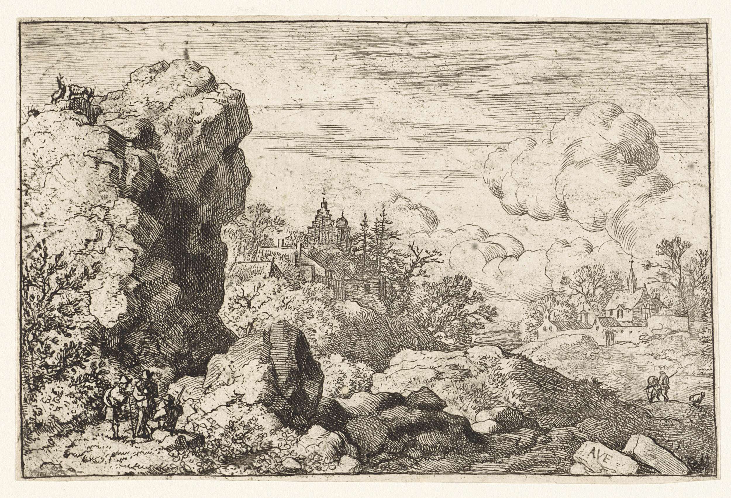 Berglandschap met op de voorgrond drie personen onderaan een hoge rots. Op de achtergrond twee kerktorens.