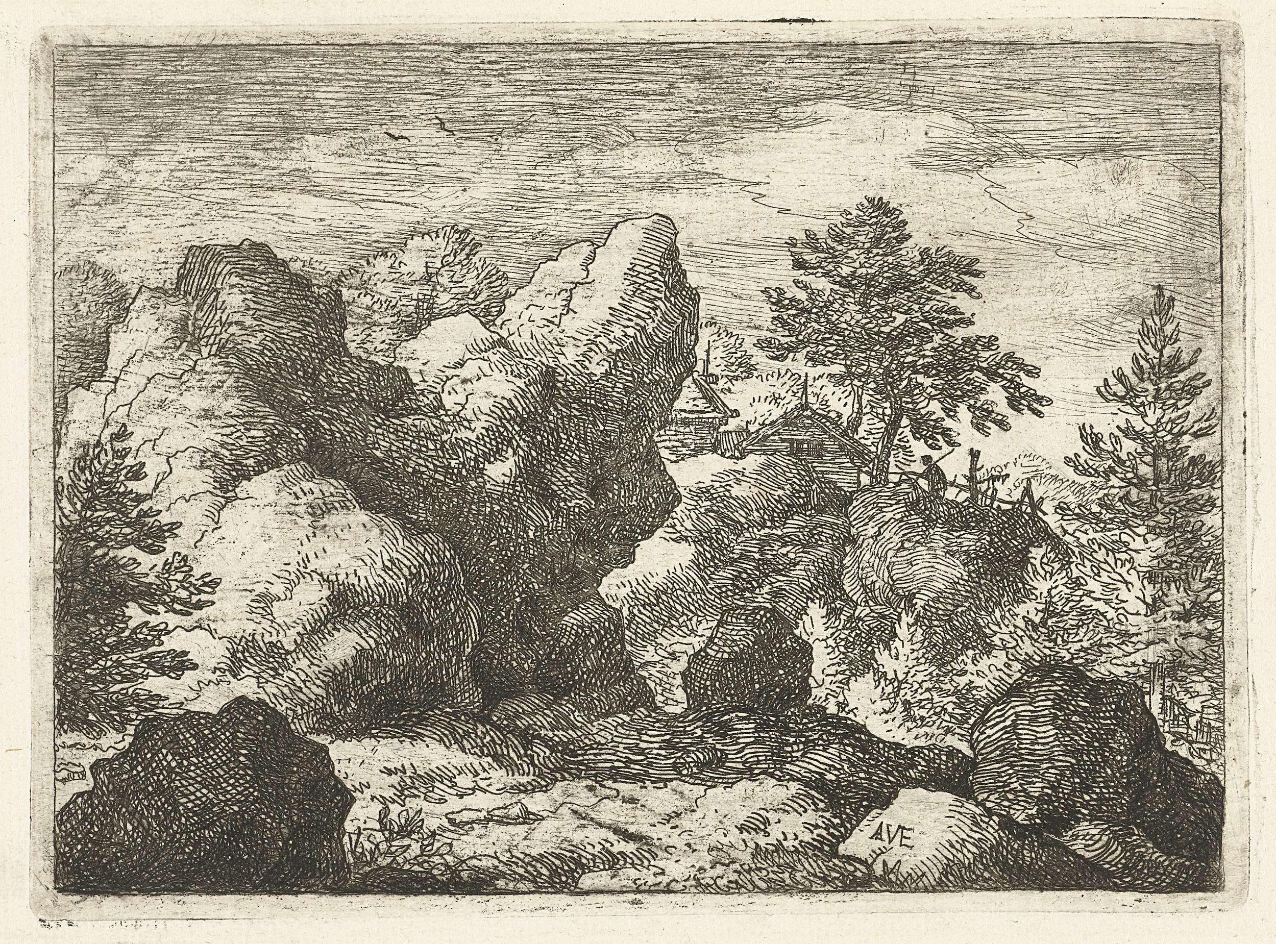 Rotslandschap met op de achtergrond een persoon en twee huisjes.