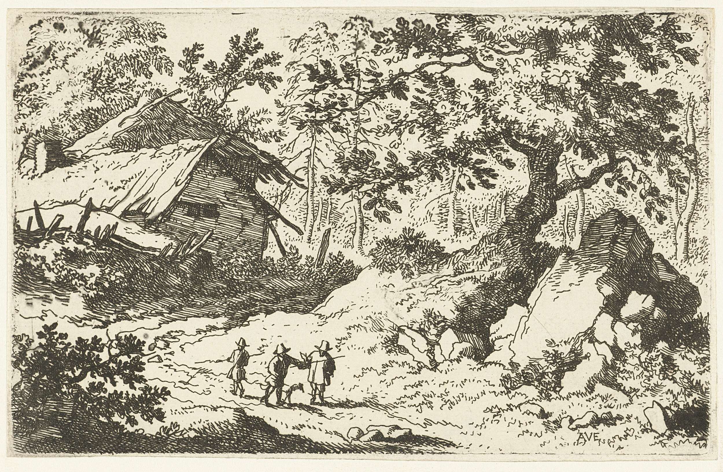 Landschap met drie personen en een hond op een pad bij een vervallen huis.