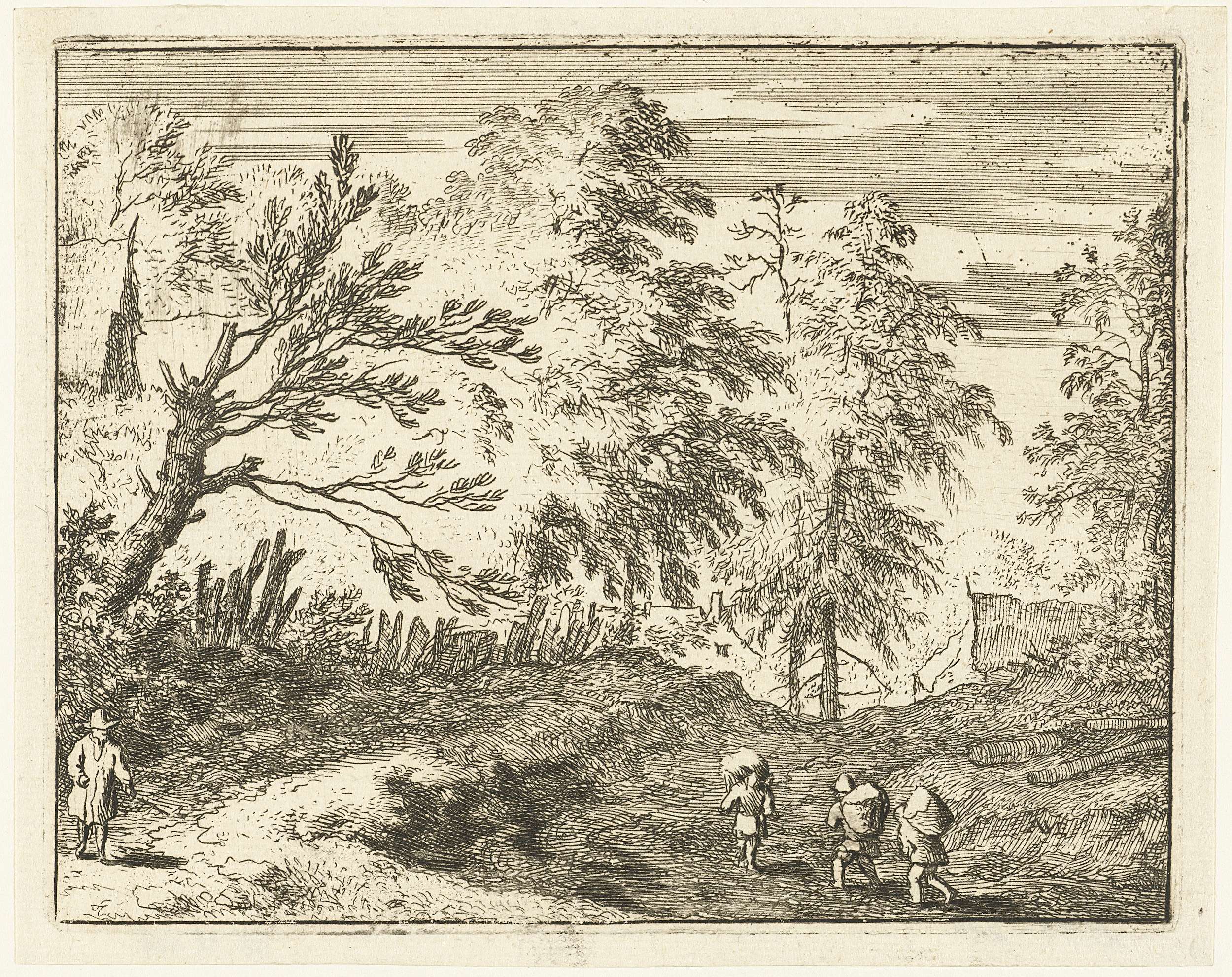 Landschap met drie kruiers en een wandelaar. Aan de horizon, achter hoge bomen, enkele huizen.