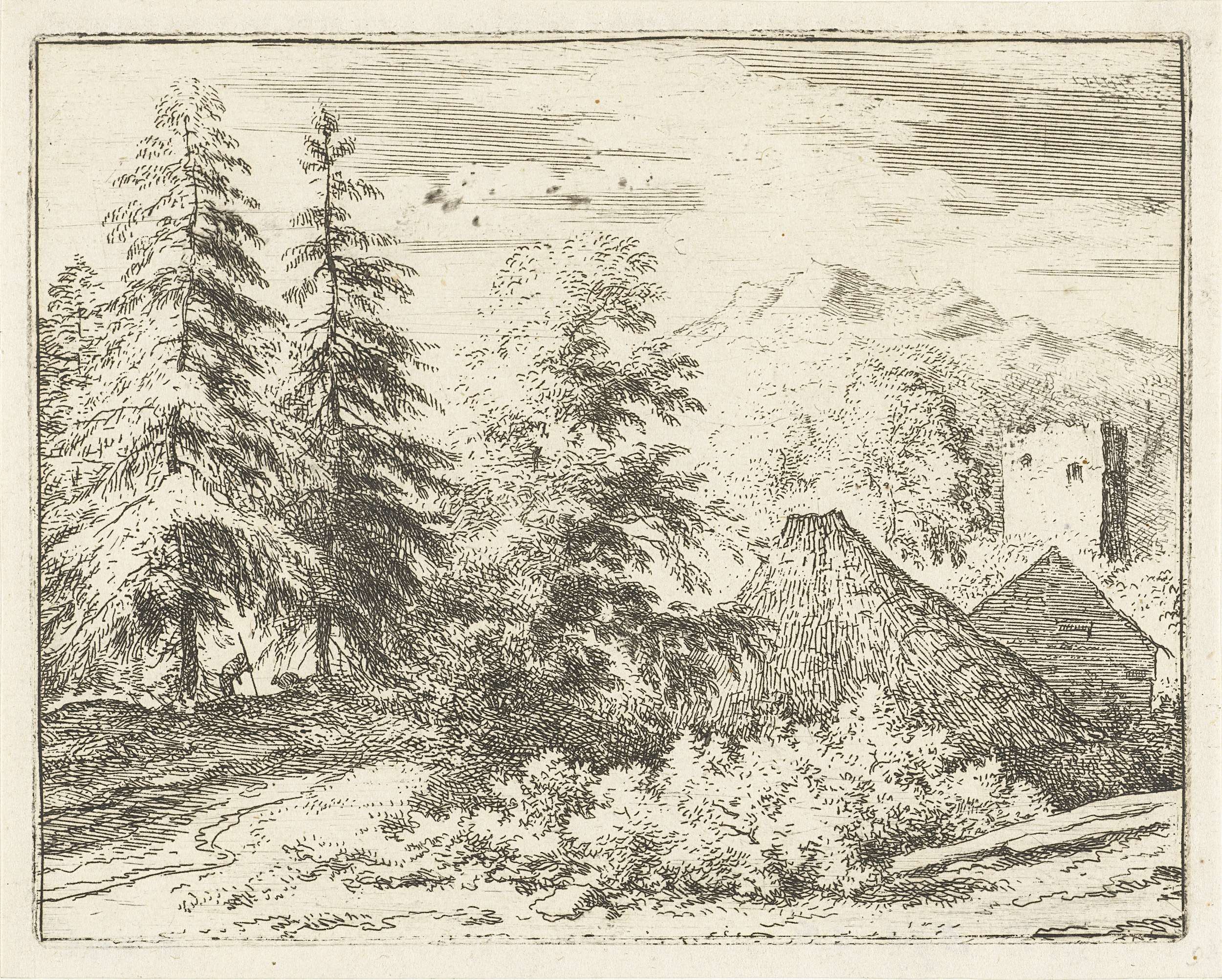 Landschap met de daken van twee huizen zichtbaar tussen bomen en struikgewas. Tussen twee hoge sparren op de achtergrond staat een man met een stok.
