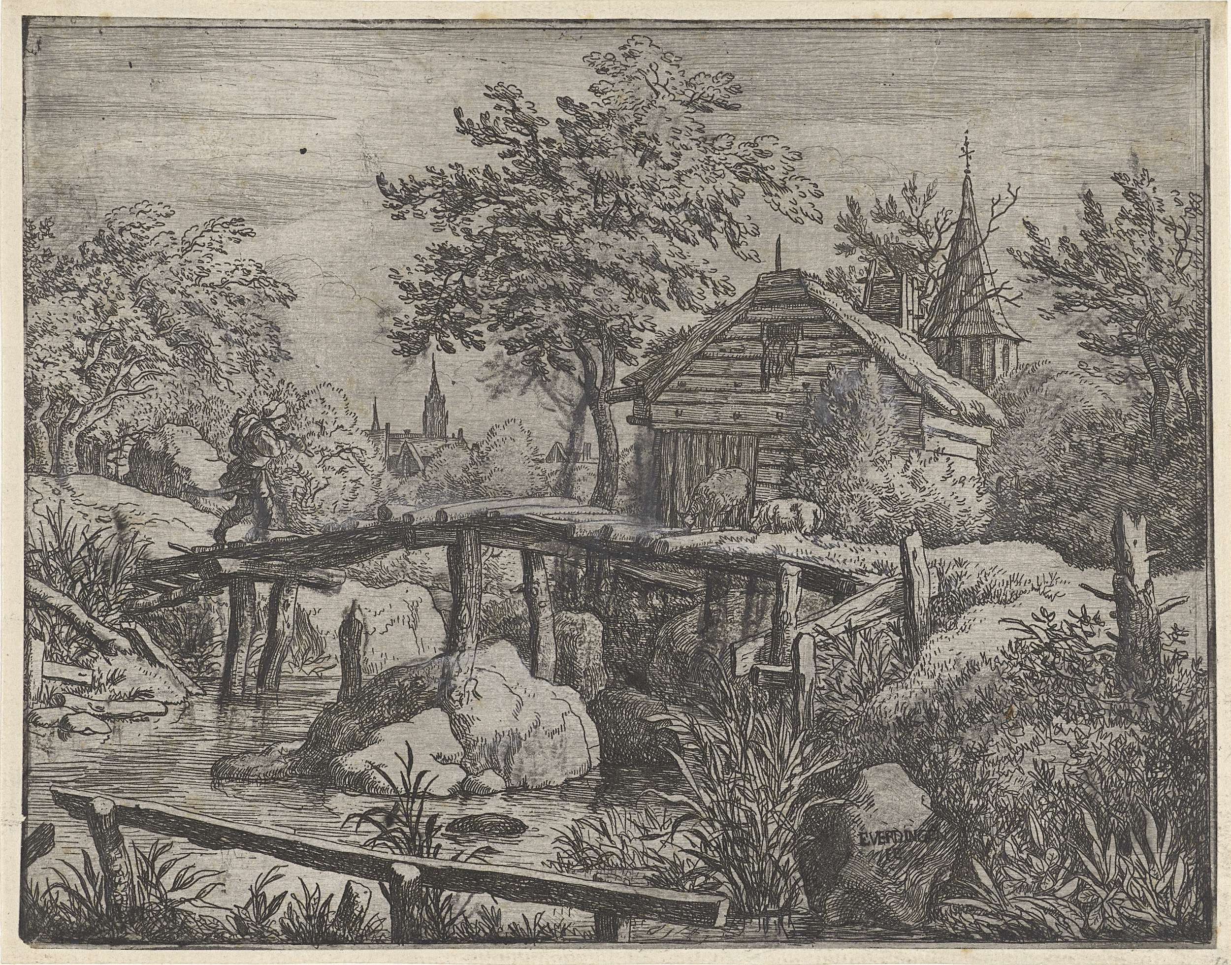 Landschap met een houten brug, schuur en op de achtergrond een kerktoren. Vóór de schuur twee schapen en op de brug een man met een knapzak.