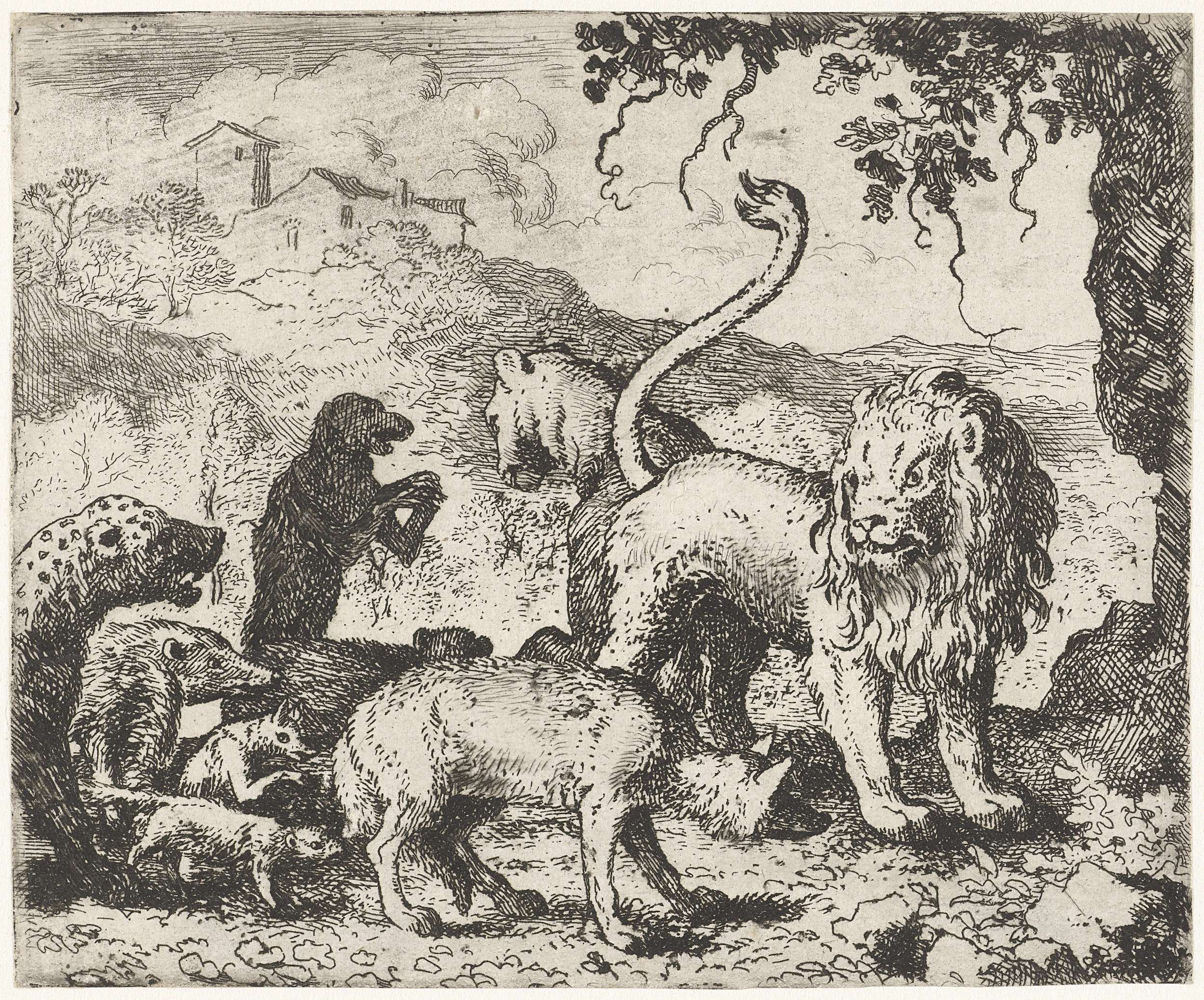 Een groep dieren, waaronder de leeuw, koning Nobel en op de voorgrond de beschuldigde Reinaert de vos. Op de achtergrond doet Isengrijn de wolf zijn beklag.