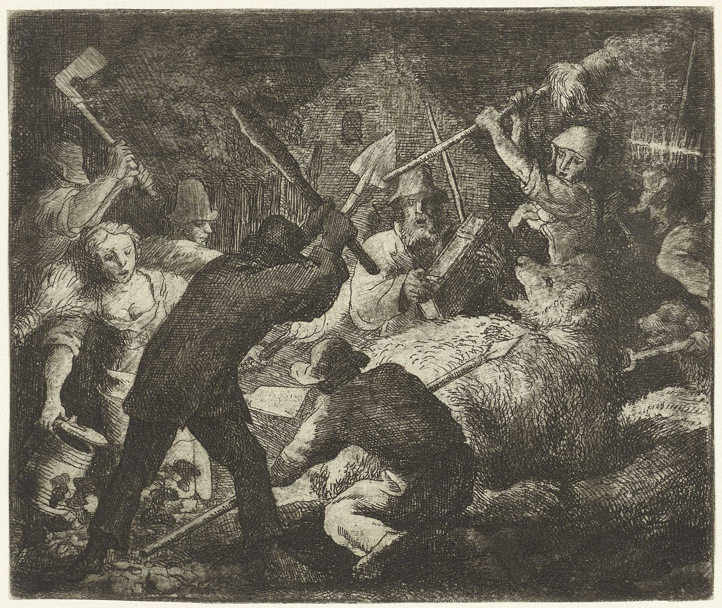 Boeren slaan met stokken, speren en bijlen op de gevangen Bruun de beer.