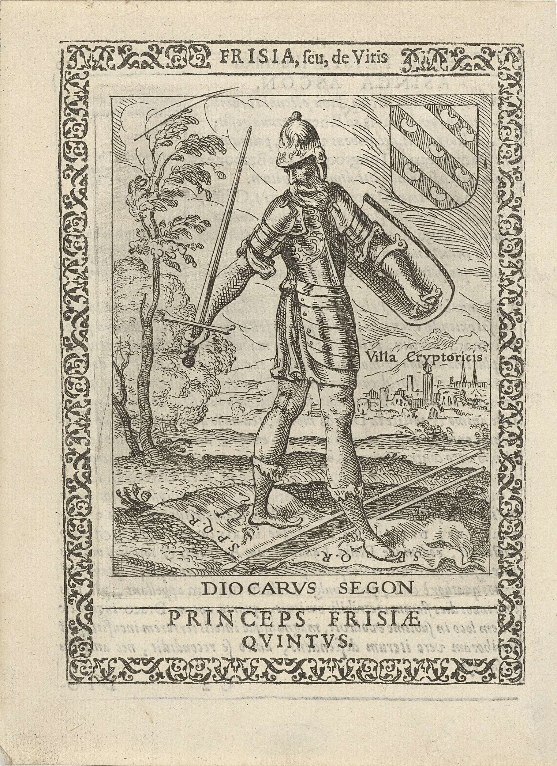 Diocarus Segon, vijfde prins der Friezen. Staande ten voeten uit, zwaard en schild in de hand. In een ornamentale omlijsting. Illustratie, met tekst op achterzijde, afkomstig uit het boek: Frisia seu de viris rebusque Frisiae illustribus libri duo.