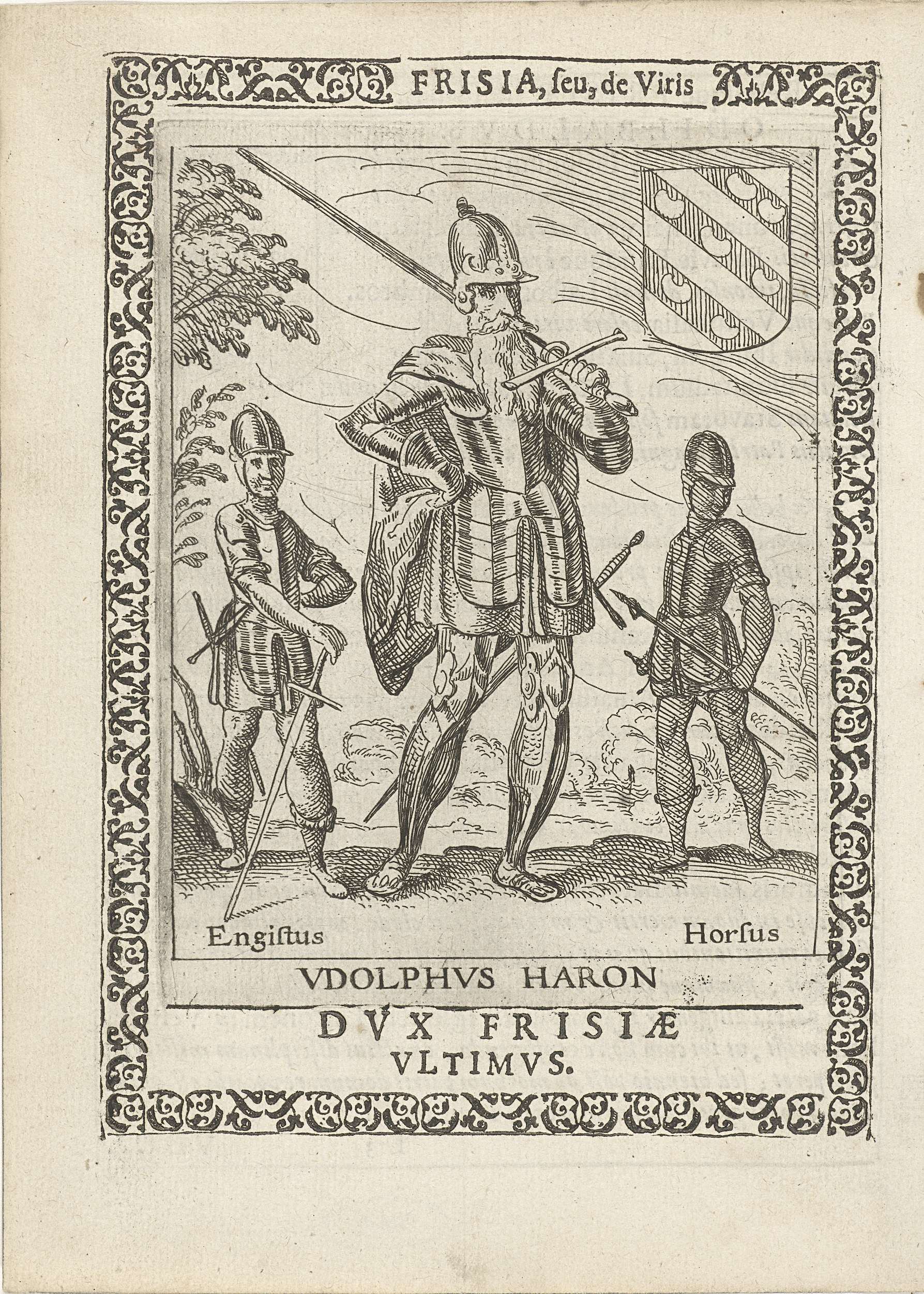 Udolf Haron, laatse hertog der Friezen. Staande ten voeten uit, zwaard over de schouder. Op de achtergrond Hengist en Horsa. In een ornamentale omlijsting. Illustratie, met tekst op achterzijde, afkomstig uit het boek: Frisia seu de viris rebusque Frisiae illustribus libri duo.