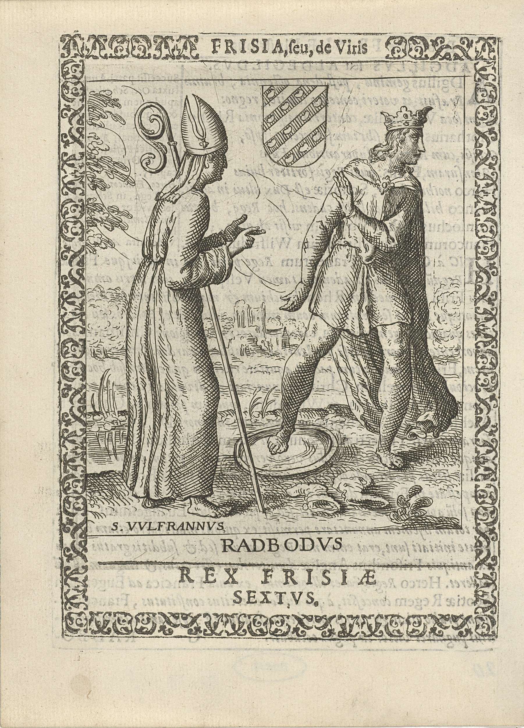 Radbod, zesde koning der Friezen, weigert zich te laten dopen. In een ornamentale omlijsting. Illustratie, met tekst op achterzijde, afkomstig uit het boek: Frisia seu de viris rebusque Frisiae illustribus libri duo.