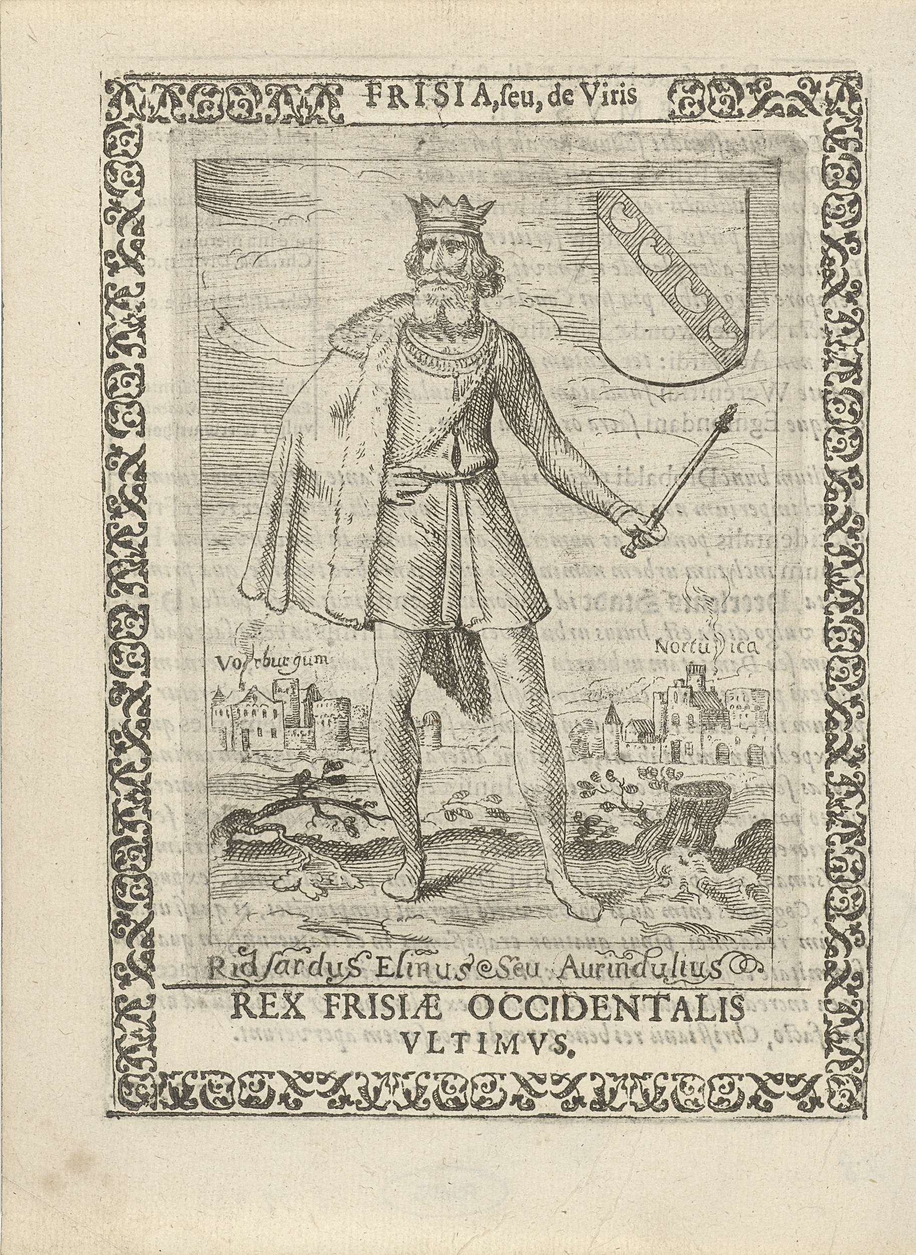 Riedsardus Elinus of Aurindulius, laatste koning der West-Friezen. Staande ten voeten uit, scepter in de hand. Op de achtergrond Voorburg en Noordwijk. In een ornamentale omlijsting. Illustratie, met tekst op achterzijde, afkomstig uit het boek: Frisia seu de viris rebusque Frisiae illustribus libri duo.