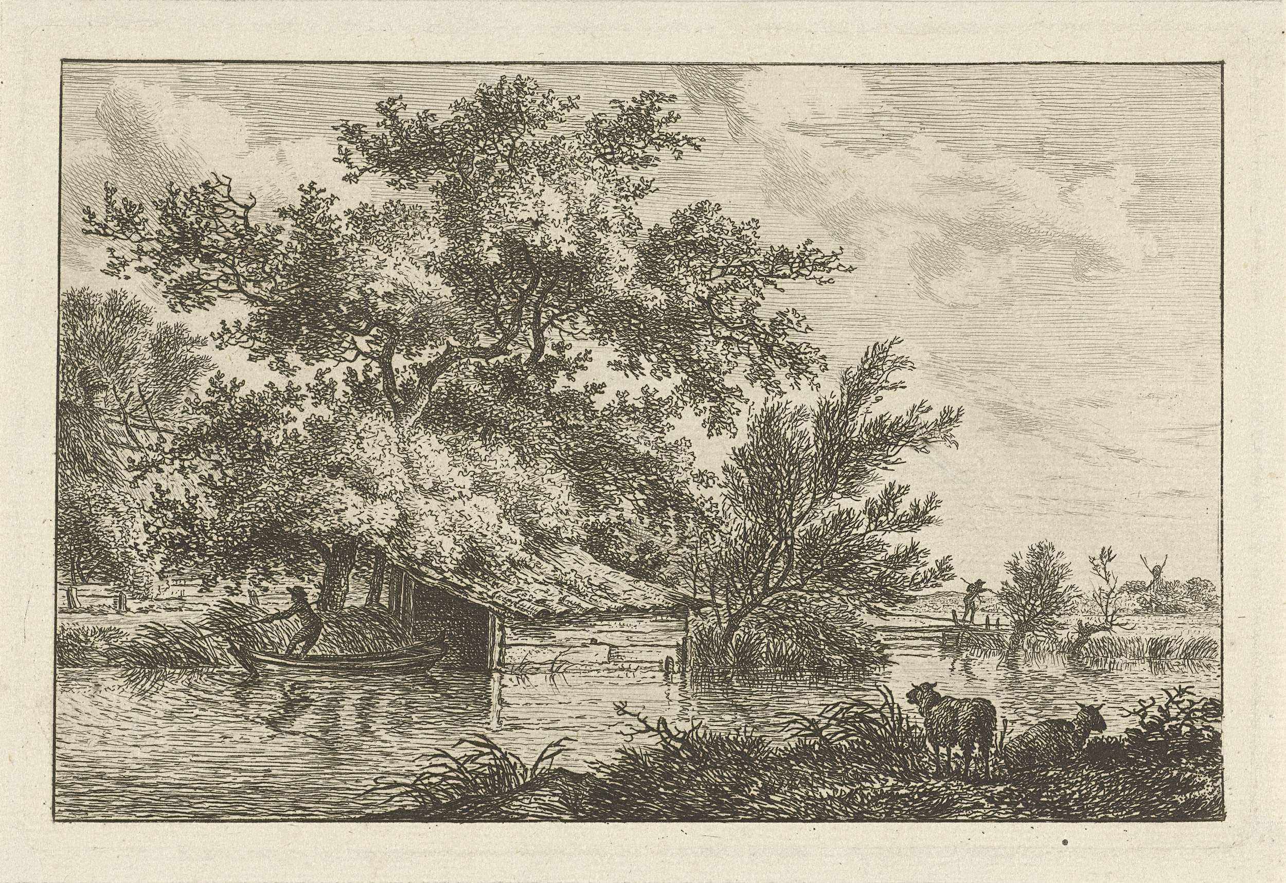 Rivierlandschap met een roeiboot bij een klein boothuis. Op de oever op voorgrond twee schapen. Op de achtergrond een wandelaar bij een knotwilg.