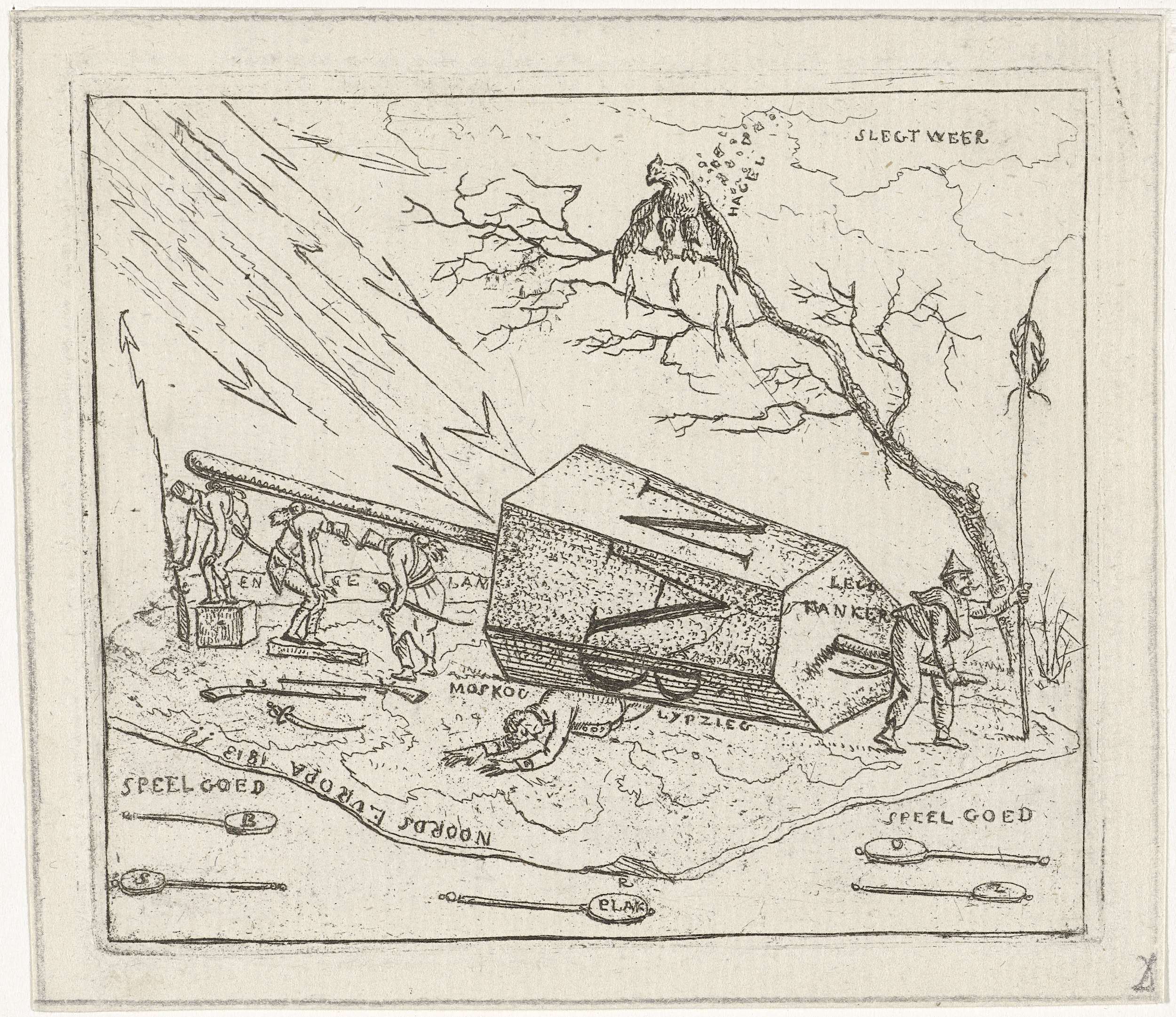 Op een tapijt met de kaart van Europa ligt Napoleon verpletterd onder een zeshoekig blok met de letters: NAB. De Franse adelaar is zwaar gehavend door het slechte weer. De Franse soldaten proberen te schuilen voor bliksem die op hun afgevoerd wordt. Verwijzing naar de nederlagen van de Franse troepen bij Moskou en Leipzig.