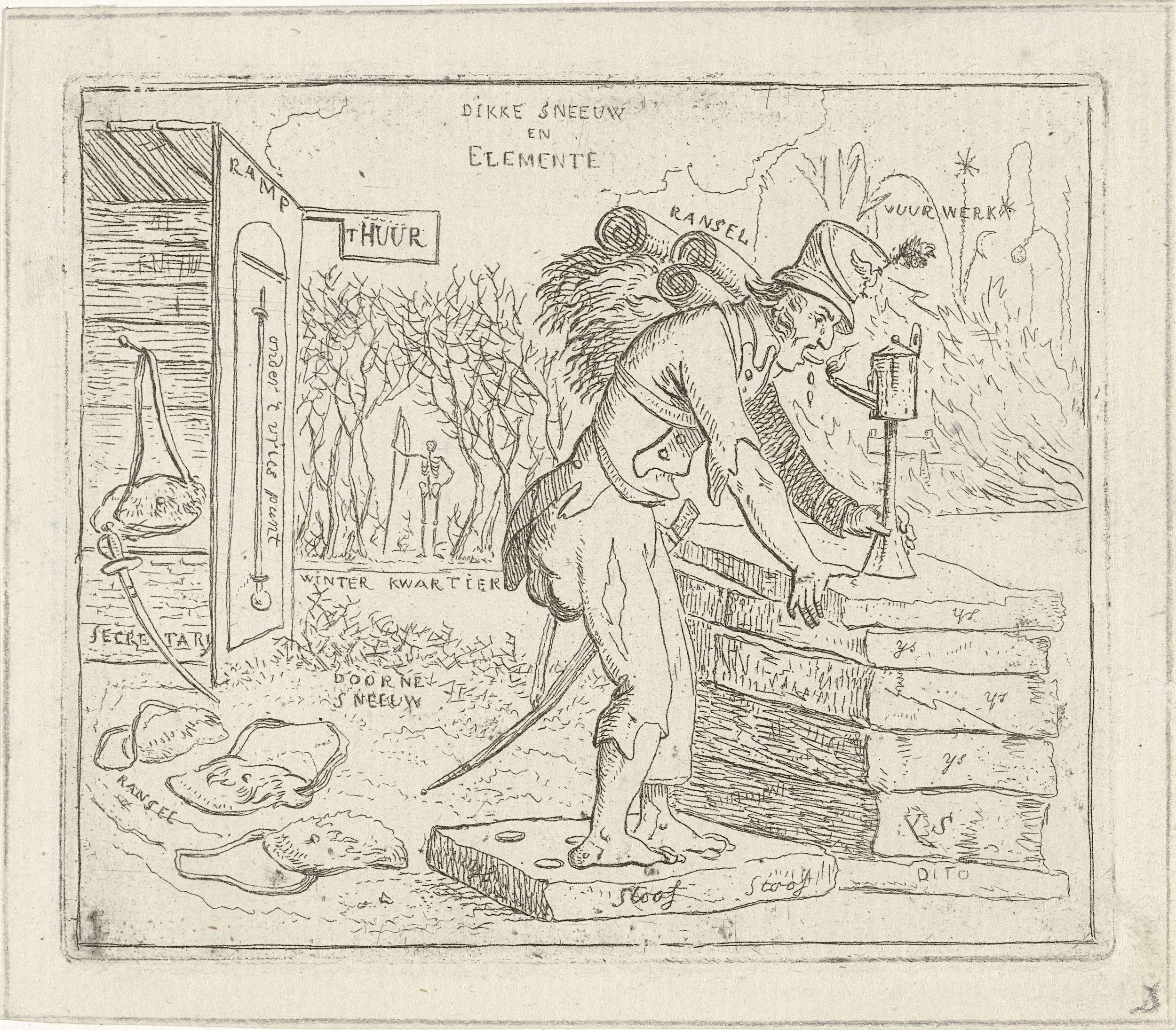 Een Franse soldaat probeert zijn tong te ontdooien aan een olielamp. Met zijn blote voeten staat hij op een blok ijs. Op de achtergrond vuurwerk en een winterkwartier waarin een geraamte van een soldaat staat. Spotprent op de verliezen van de Fransen veroorzaakt door de barre weersomstandigheden in Rusland.
