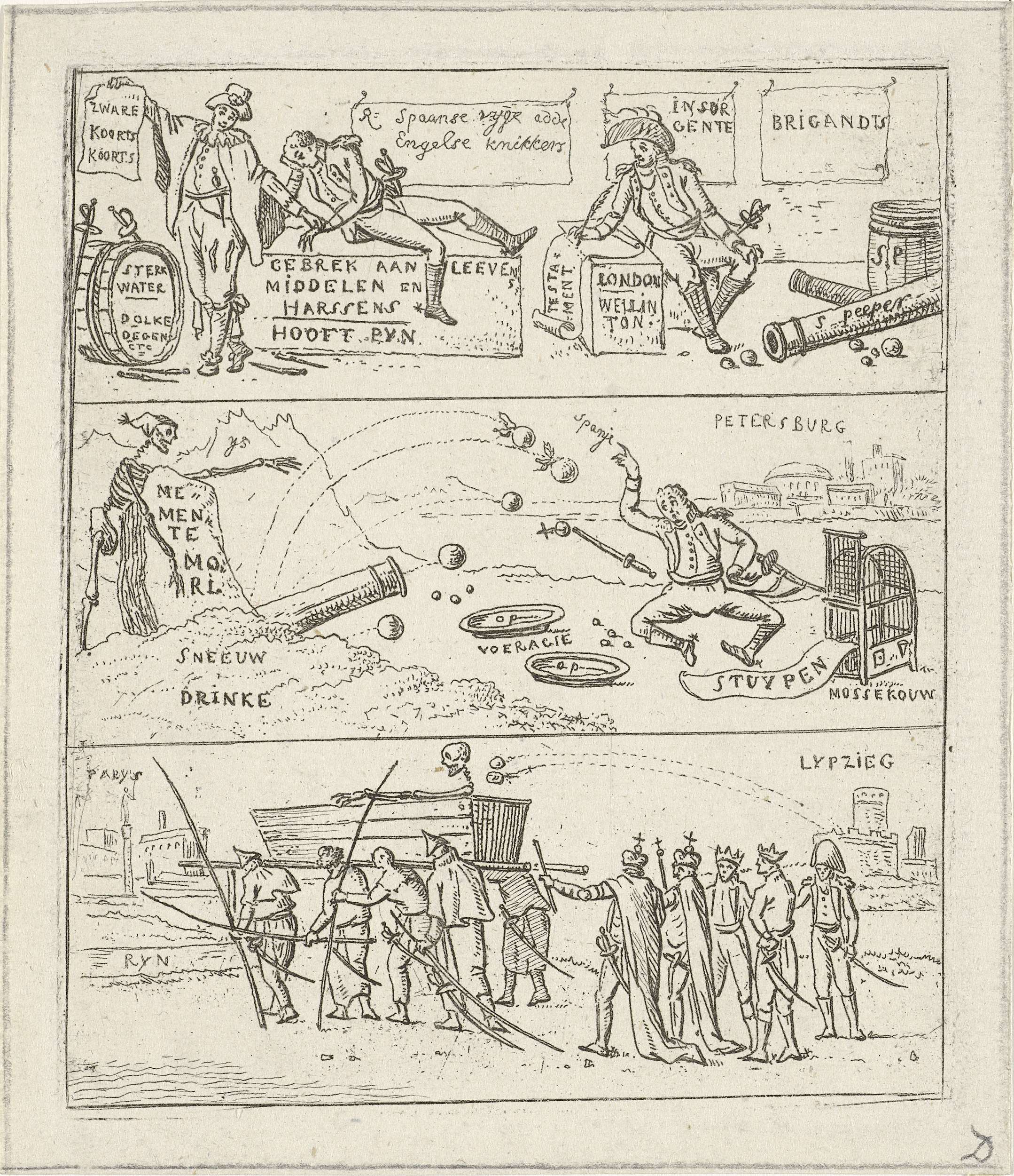 Boven een Franse soldaat die zijn testament maakt na de nederlaag van de Fransen in Spanje. In het midden een soldaat die door kogels getroffen wordt. Op de achtergrond de stad St. Petersburg. Onder wordt een doodskist met een geraamte terug naar Parijs gedragen. Uit de stad Leipzig komt een kanonskogel gevlogen.