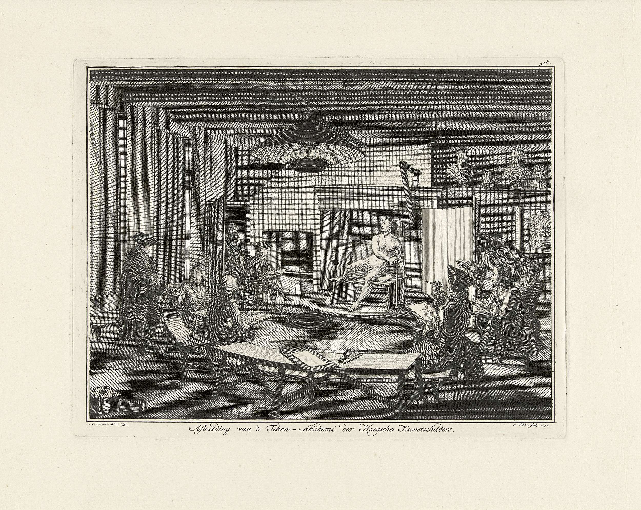 Lokaal waarin figuren met tekengerei rondom een naaktmodel zitten. Rechts op de achtergrond staan tegen de muur bustes en een beeld van een romp.