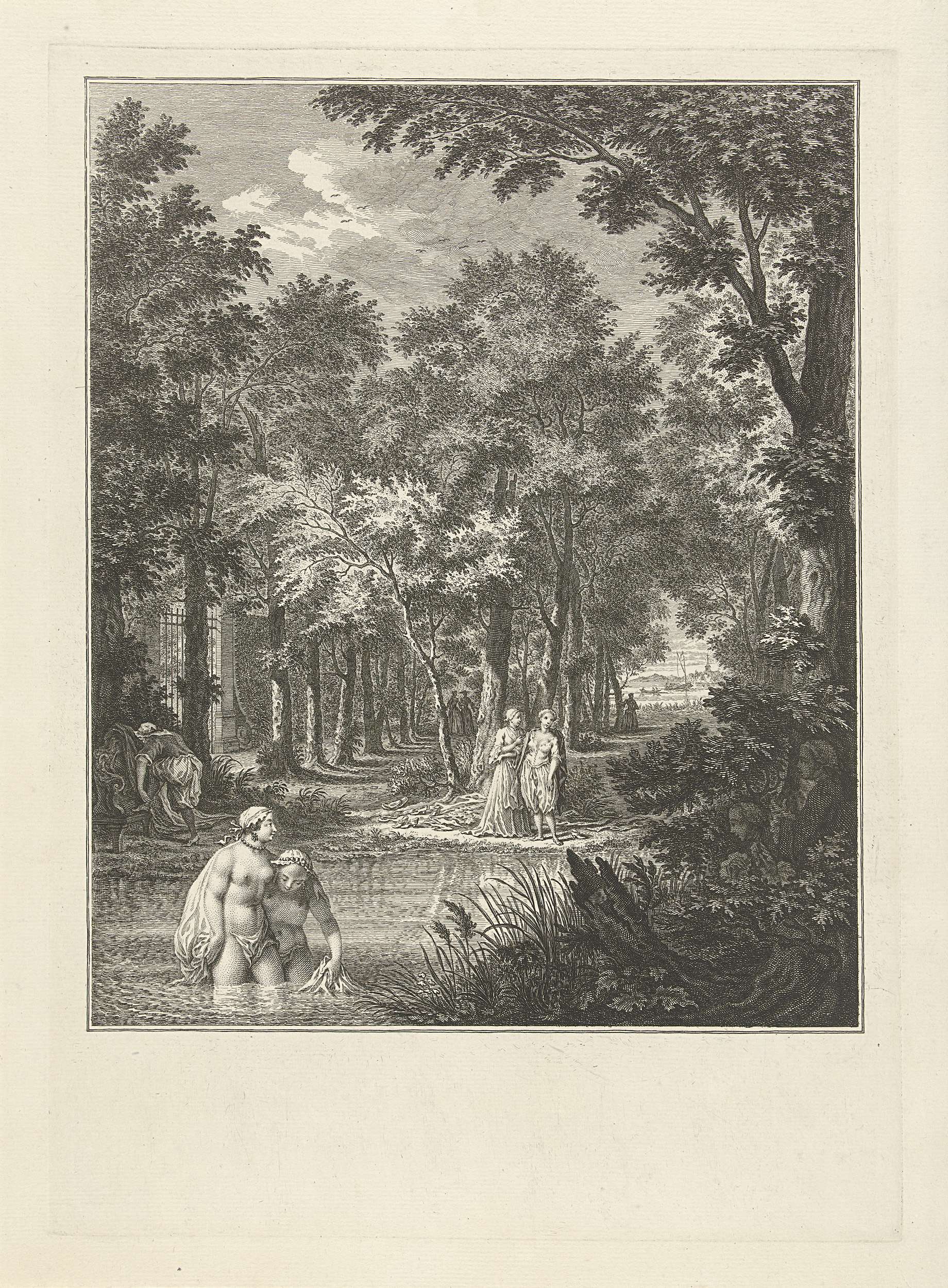 Twee badende dames worden bespied door twee heren in het struikgewas. Op de achtergrond wandelen tussen de bomen enkele figuren.