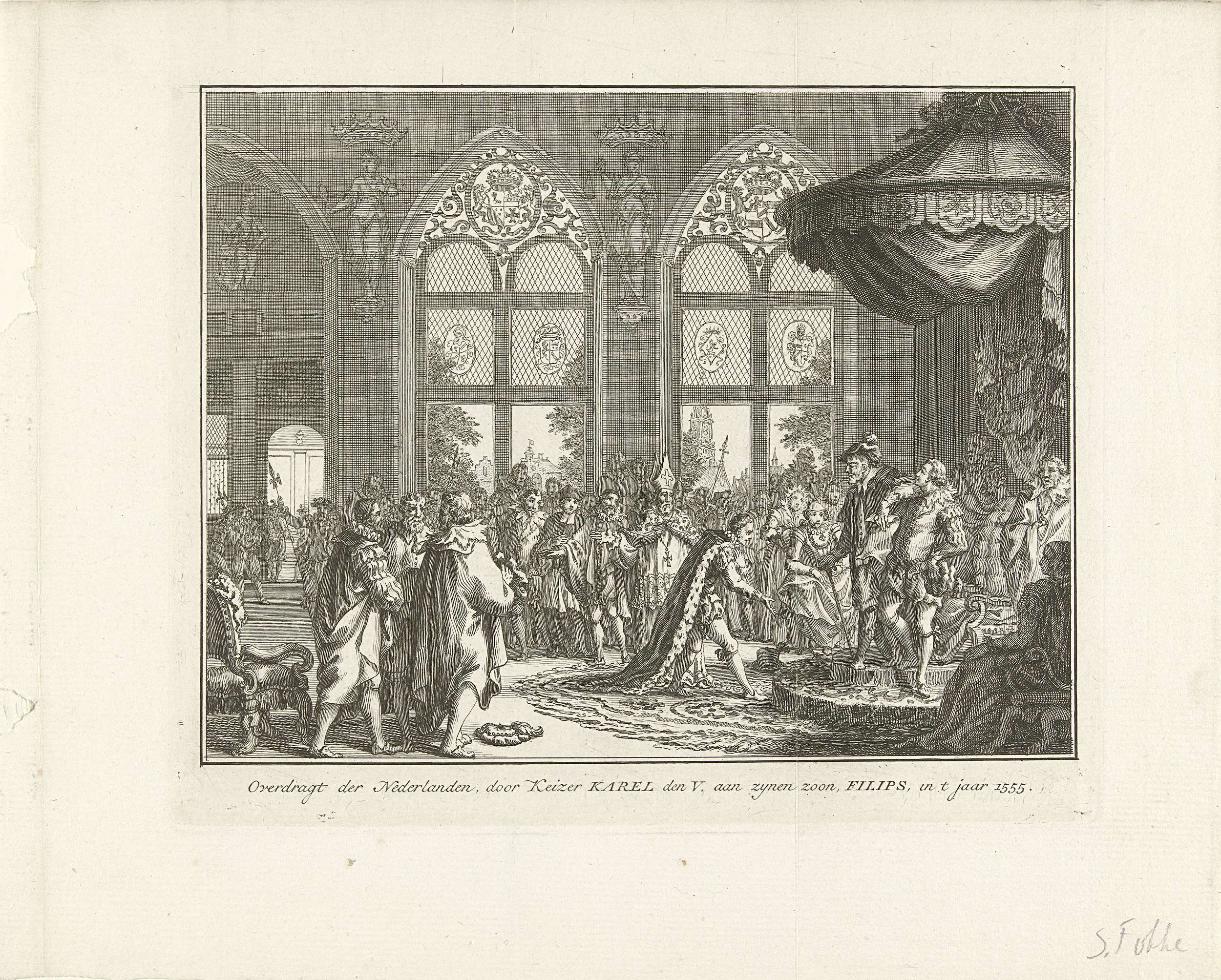 Filips II maakt een buiging voor Karel V, die op een verhoging staat. Karel V leunt met zijn elleboog op de schouder van Prins Willem van Oranje. Omstanders in de zaal wonen de overdracht van de regering bij.