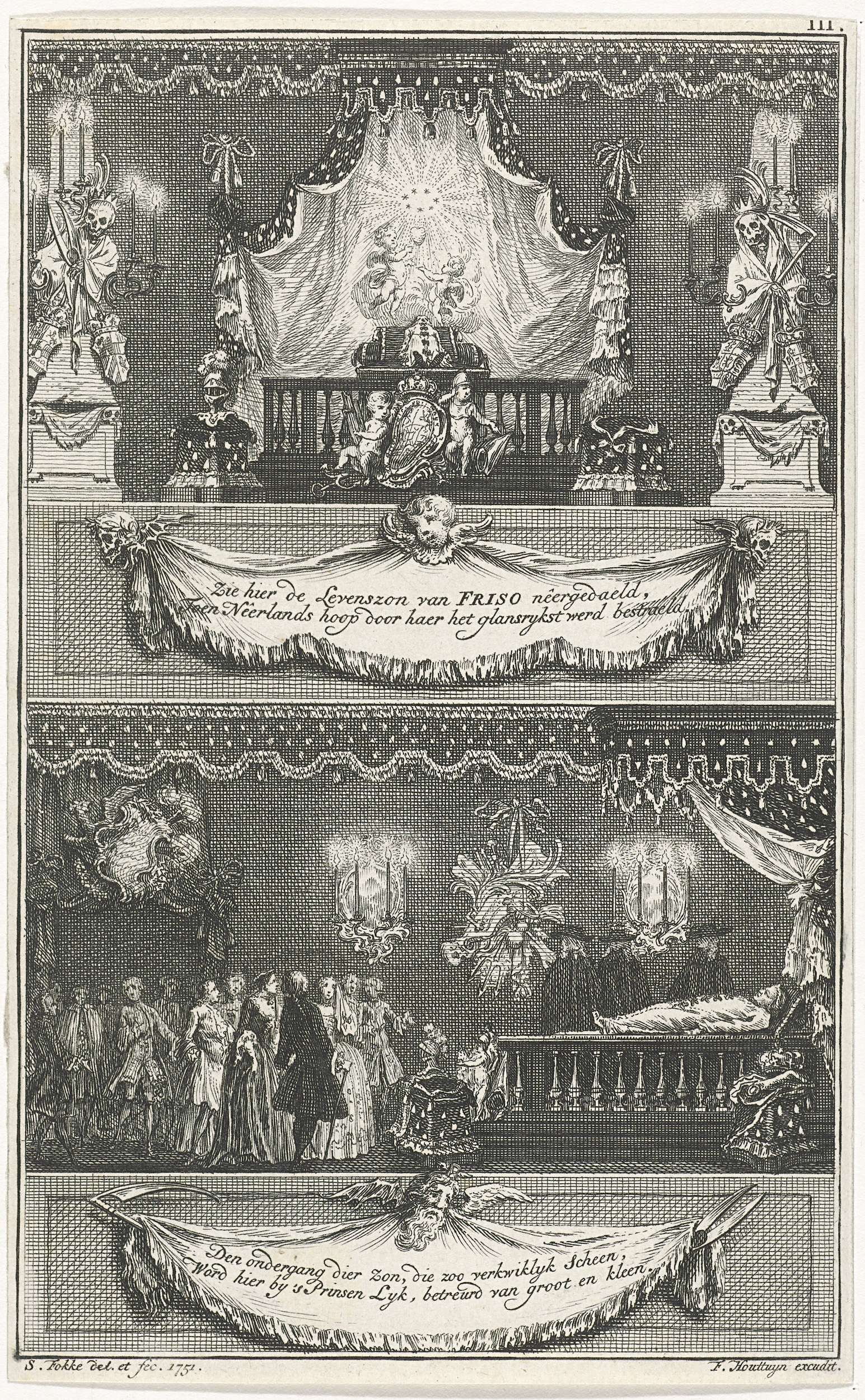 De zaal en het praalbed waarop het lijk van Willem IV in november en december 1751 opgebaard heeft gelegen. Twee kleine voorstellingen boven elkaar, elk voorzien van een onderschrift . Rechtsboven gemerkt en half afgesneden: III.