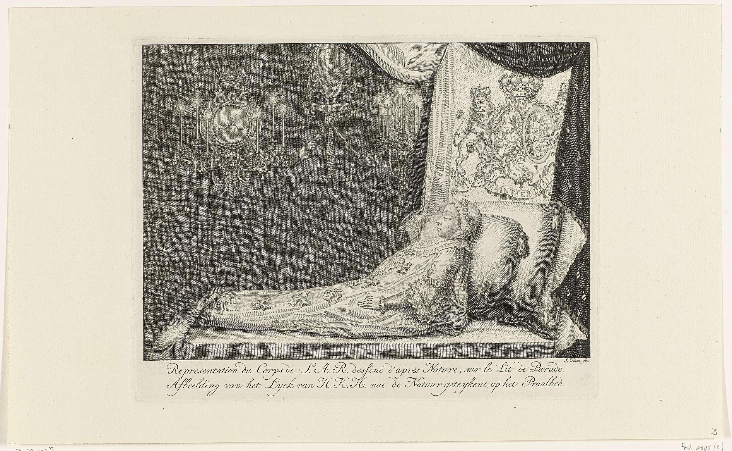 Het lijk van Anna van Hannover, prinses van Oranje-Nassau en weduwe van Willem IV, op het praalbed. Boven het hoofdeinde de wapens van de Verenigde Nederlanden en Engeland, gekroond en geflankeerd door de Nederlandse leeuw.