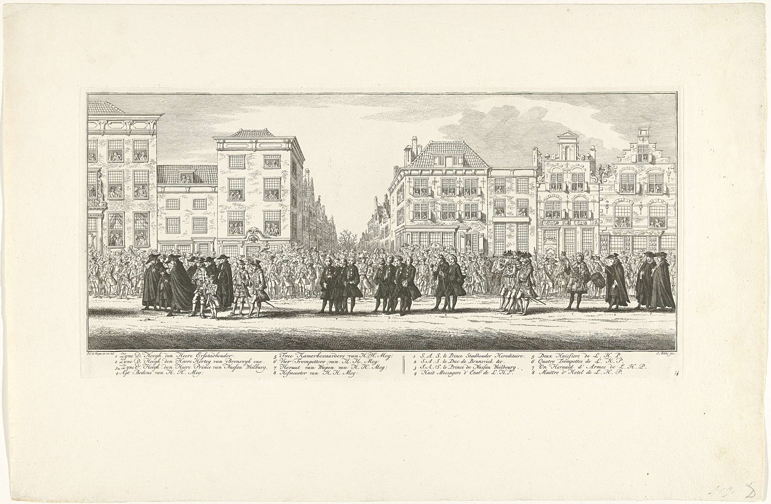 Willem V gevolgd door hofdienaren te voet in de lijkstoet van Anna van Hannover, prinses van Oranje-Nassau, te Delft. Enkele figuren in de stoet zijn genummerd en onder de voorstelling nader omschreven. Het serienummer is rechtsonder met pen verbeterd.