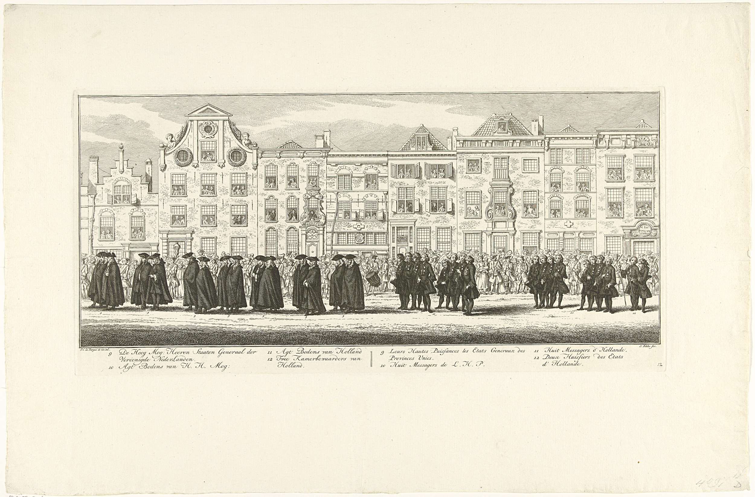 Leden van de Staten-Generaal en hofdienaren te voet in de lijkstoet van Anna van Hannover, prinses van Oranje-Nassau, te Delft. De figuren in de stoet zijn genummerd en onder de voorstelling nader omschreven.