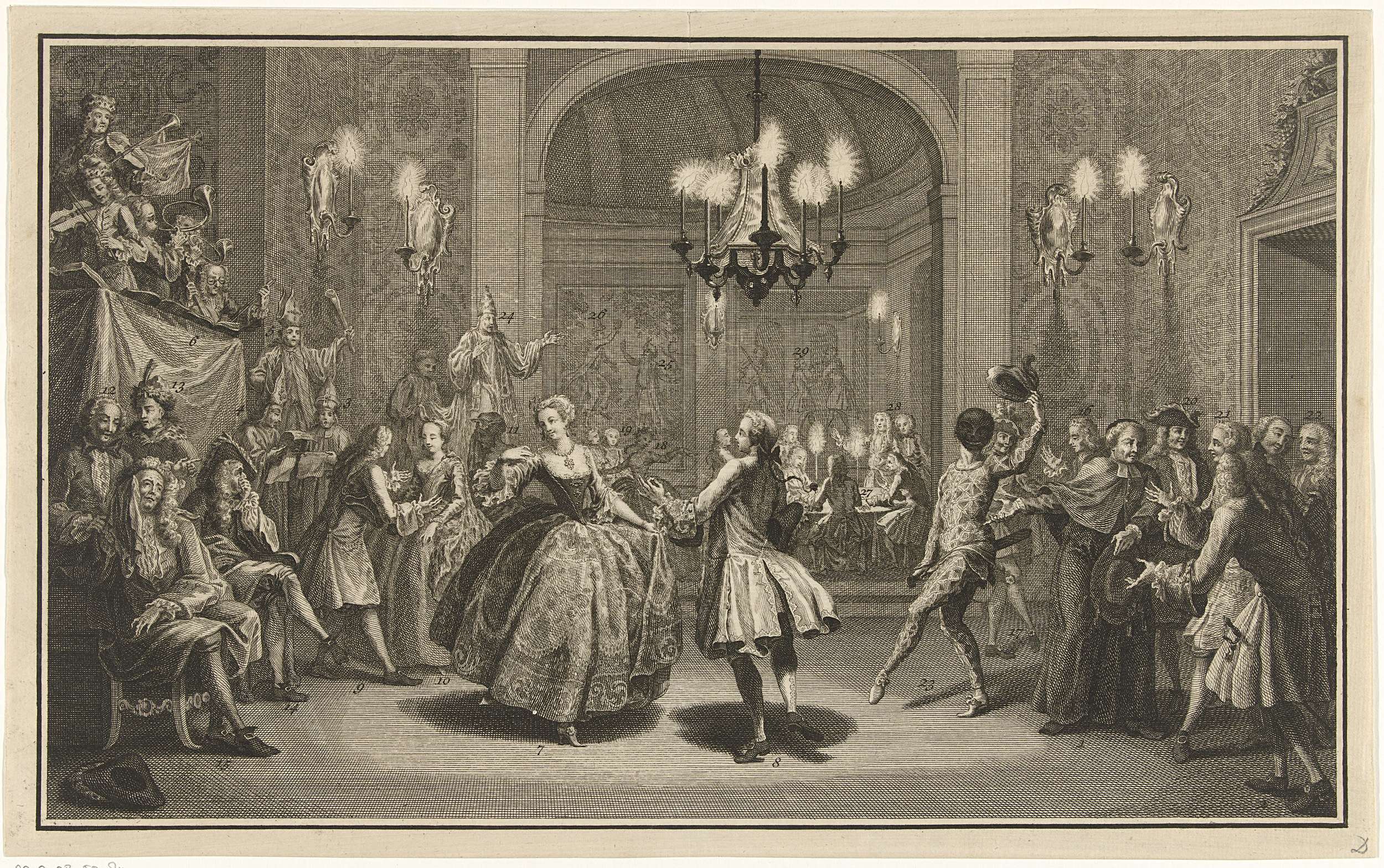 Het plechtige bal der Europese vorsten, 1742. Bal gegeven door de keurvorst van Beieren in een door kaarsen verlichte balzaal waarin centraal aartshertogin Maria Theresia met koning Frederik van Pruisen danst. Theodor von Neuhoff, de koning van Corsica, danst mee in een harlekijnspak. Andere vorsten kijken toe. Allegorie op de Oostenrijkse successieoorlog.