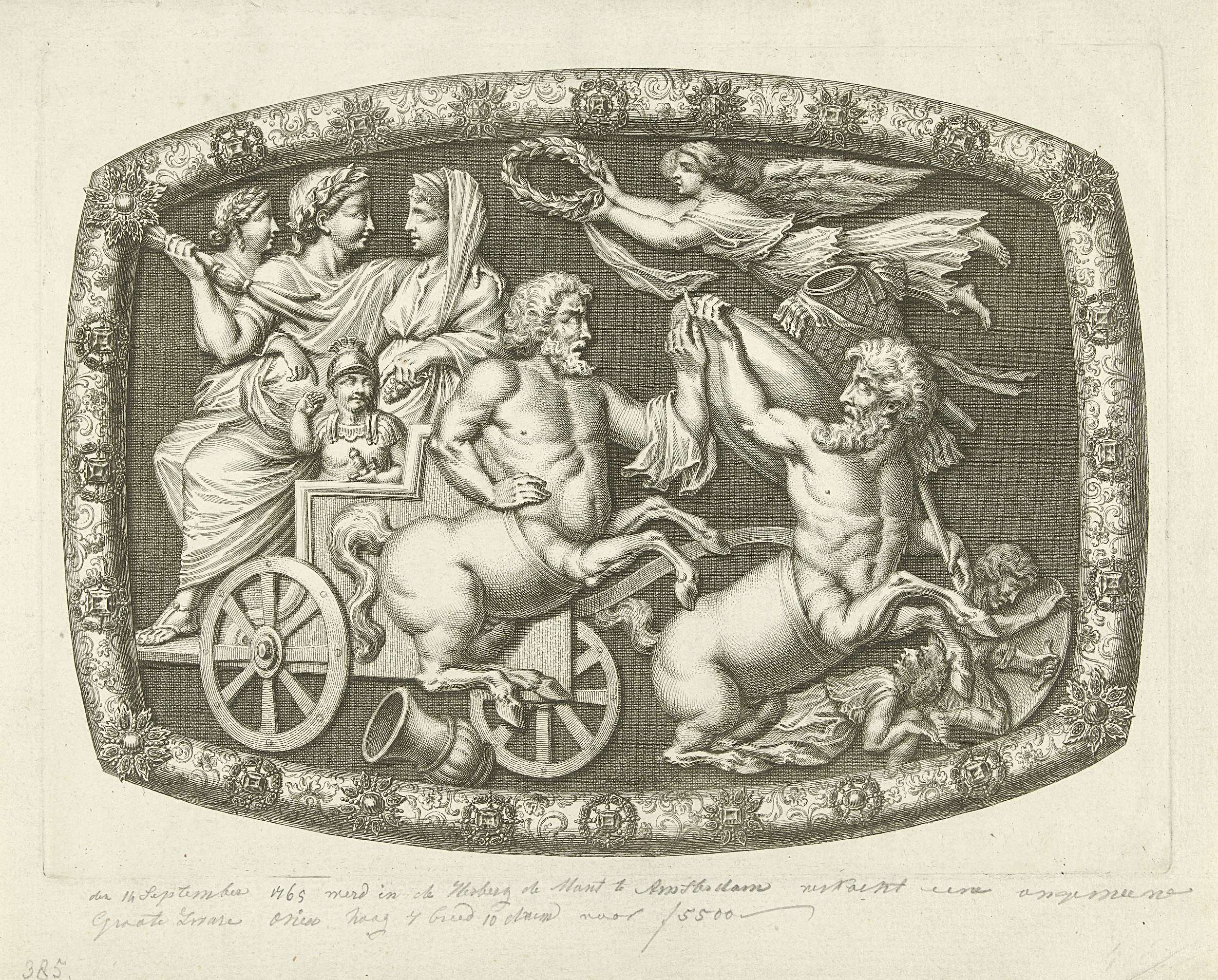 Een onyx met de beeltenis van een Romeinse praalwagen waarop een gelauwerde man met vrouw en kind zit. Voor de kar lopen twee centauren, in de lucht vliegt een engel met een lauwerkrans. Rond de onyx een rijk versierde lijst. De onyx zou op 11 september 1765 in de Munt te Amsterdam worden verkocht.