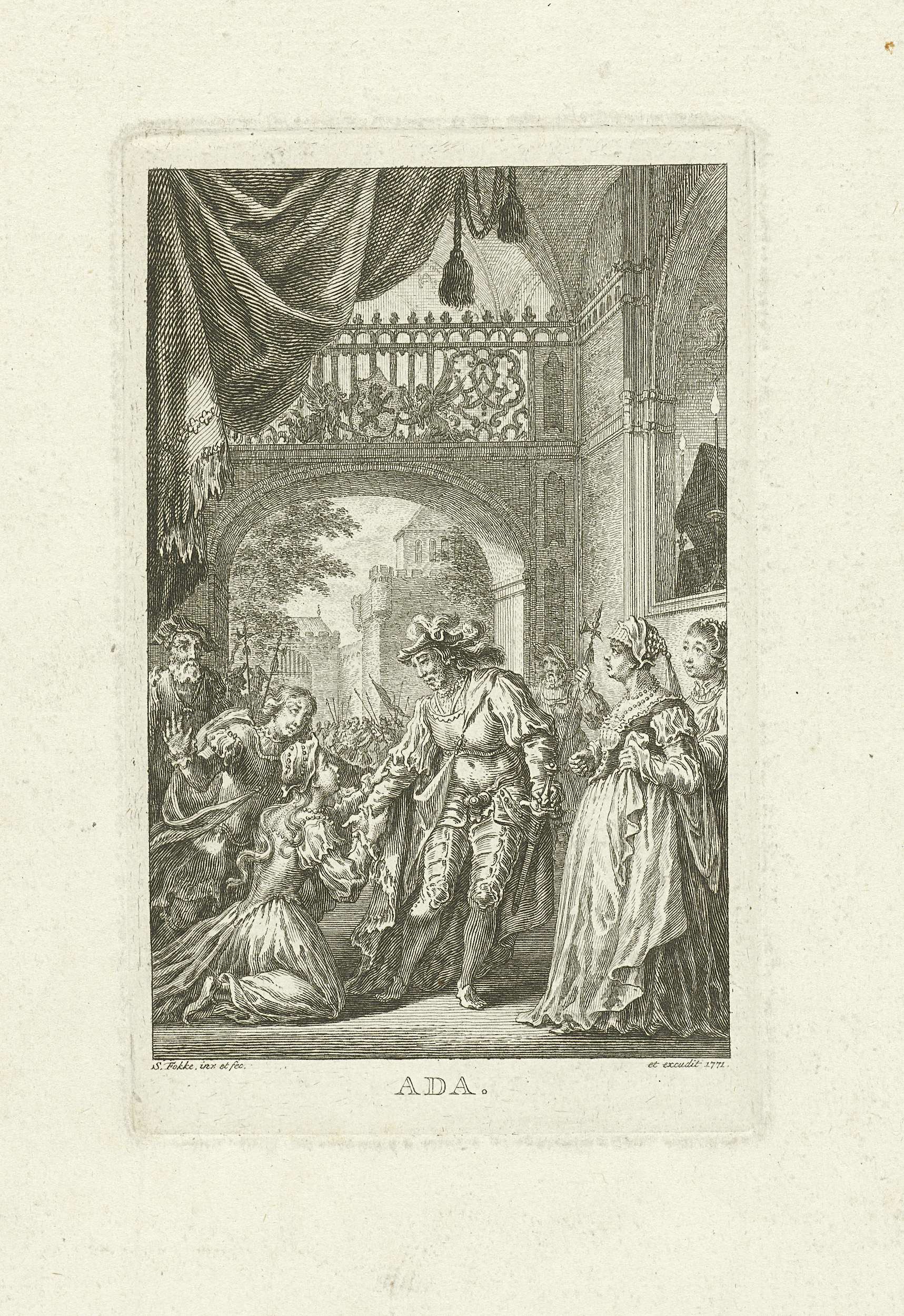 Een edelvrouw knielt voor een graaf en heeft zijn hand vastgepakt. Drie vrouwen en een man staan om hen heen en slaan het tafereel gade. Deze prent is vervaardigd voor het treurspel "Ada, gravin van Holland en Zeeland" (1765) door F. van Steenwijk.