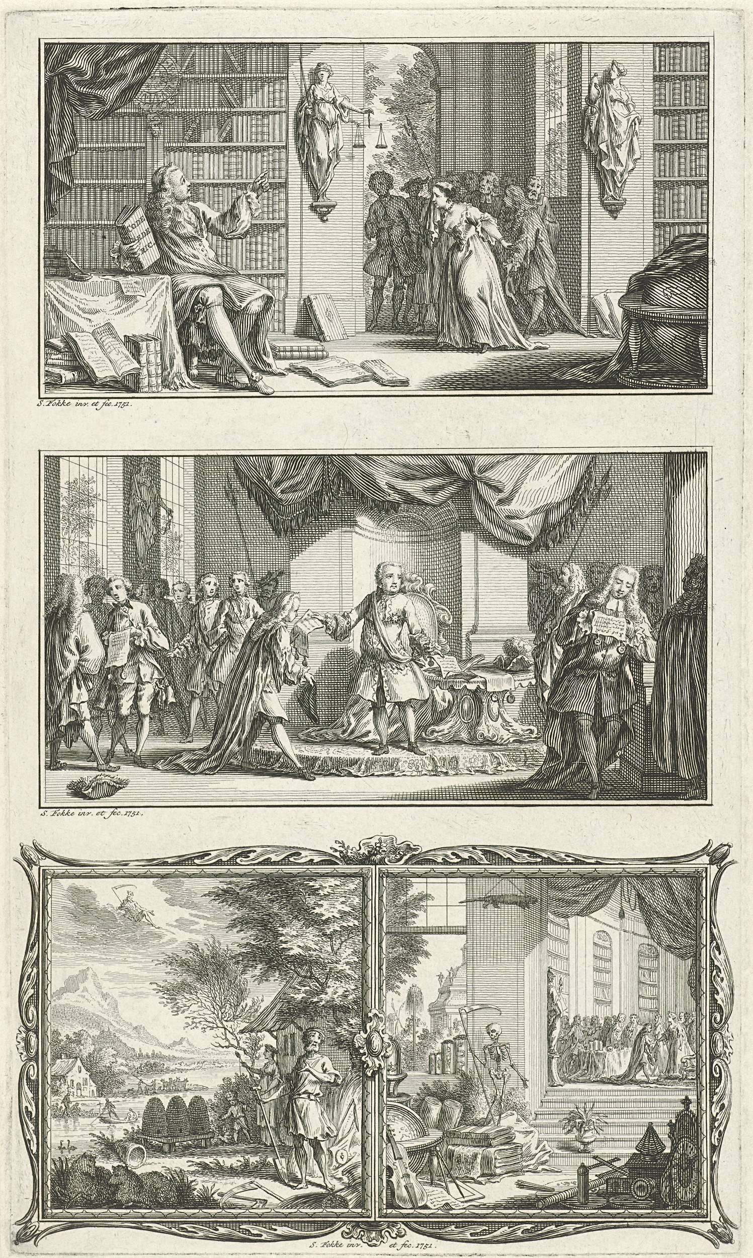 Drie illustraties boven elkaar van één plaat. Boven: Een vrouw wordt door een groep mannen een bibliotheek binnengebracht, waarin zich een man met boek en het beeld van Vrouw Justitia bevinden. Midden: Uitwisseling van documenten tussen diverse mannen. Onder: Figuur met sikkel op platteland. Rechts een skelet met eveneens een sikkel naast een huwelijksvoltrekking.