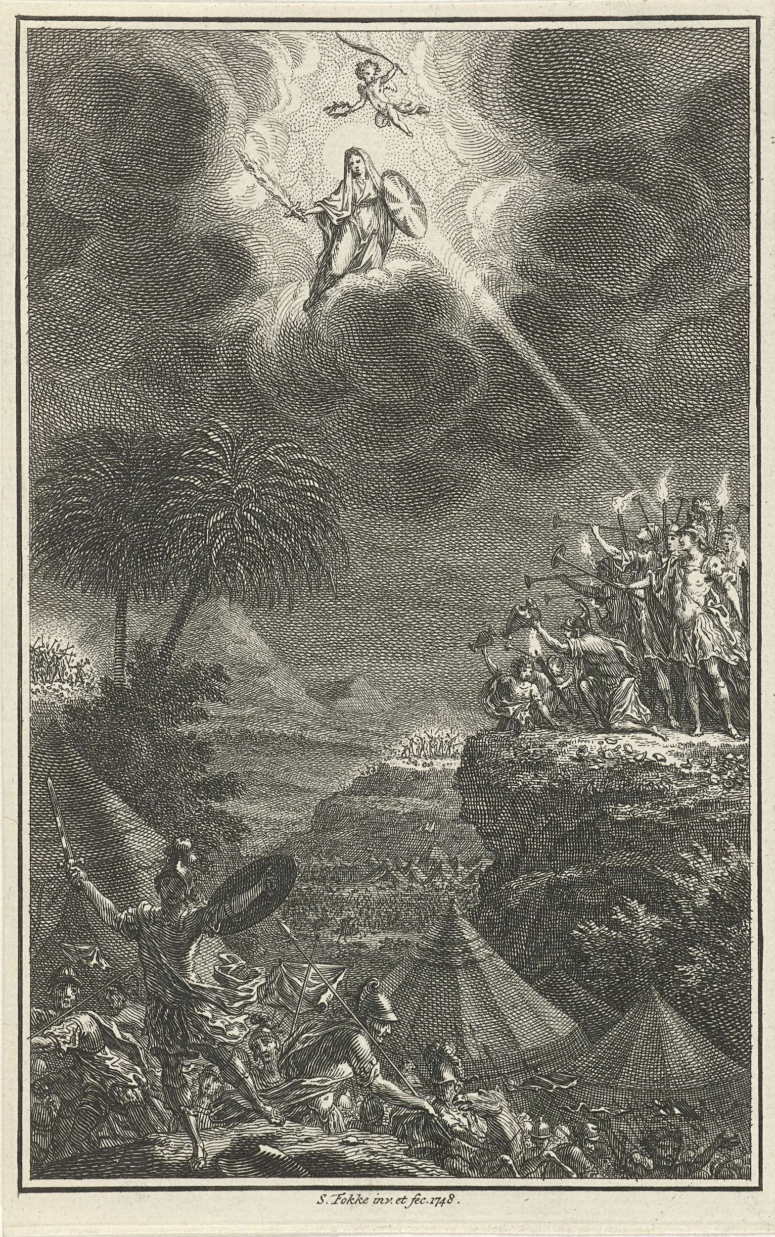 Strijdende militairen te paard en te voet bij een tentenkamp. Rechts wordt de legeraanvoerder met helm en bazuin in de hand beschenen met een bundel licht, afkomstig uit de hemel. In de wolken weerkaatst een gesluierde vrouw met brandend zwaard het licht met haar schild naar de aarde. Boven haar vliegt een putto met palmtalk ...