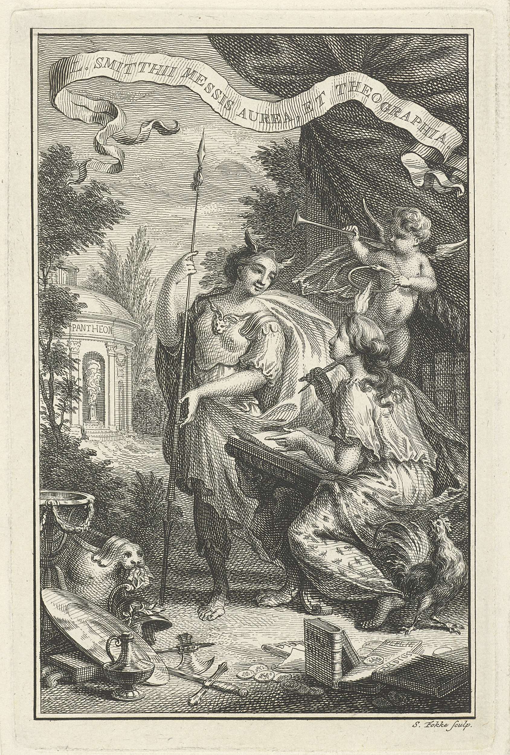 De personificatie van de Kunsten zit aan een schrijftafel en wordt door een bazuin blazende putto gekroond met het eeuwigheidssymbool: een slang die zich in eigen staart bijt. Bij haar voet loopt een haan. Voor de schrijftafel staat een vrouw met speer en twee vleugeltjes op haar hoofd. Op een banderol boven de voorstelling de ...