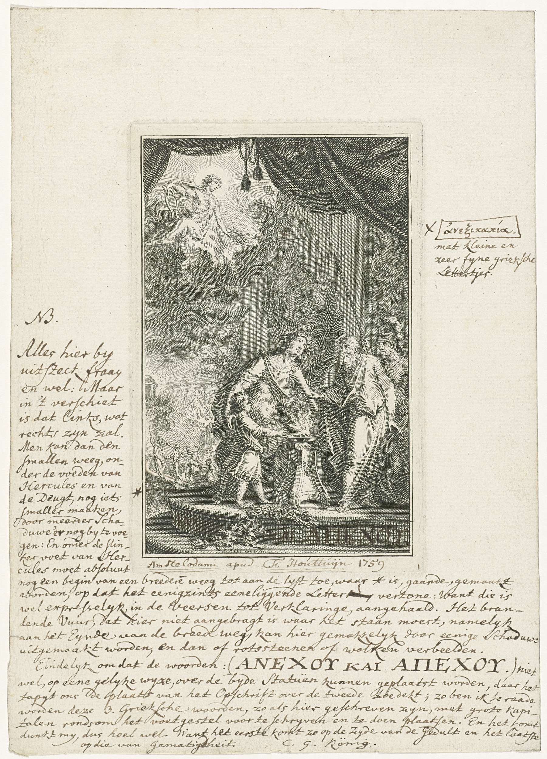 Een kale man met baard overhandigt een papierrol aan een gelauwerde man. Naast hem staat een jongetje dat zijn hand voor het vuur op de offerzuil houdt. Het drietal is in antieke kledij gehuld. Vanuit de lucht kijkt Apollo met lauwerkrans op hen neer.