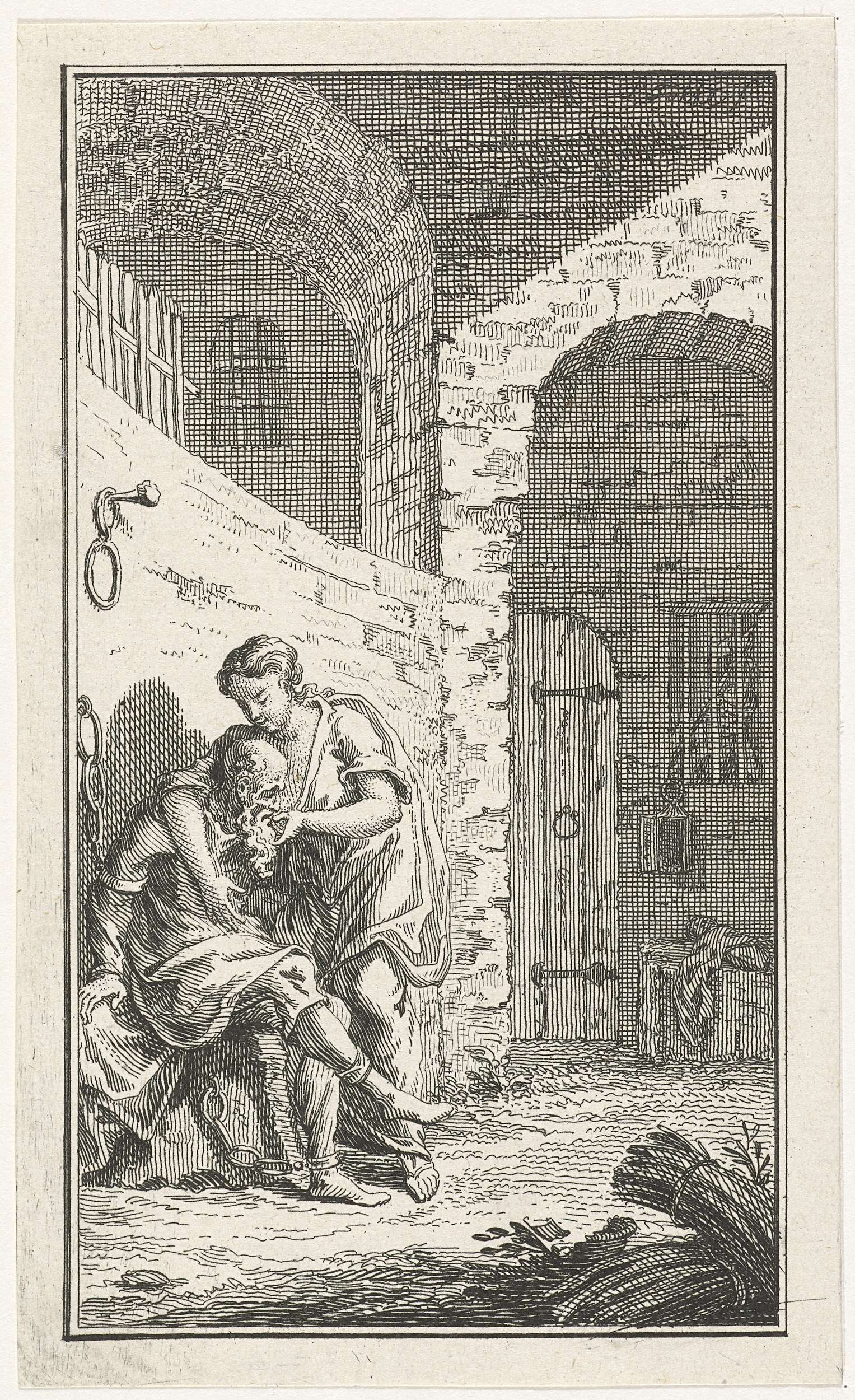 Pero geeft haar vader Cimon, die geboeid in de gevangenis zit, de borst. Op de achtergrond een soldaat voor een getralied venster.