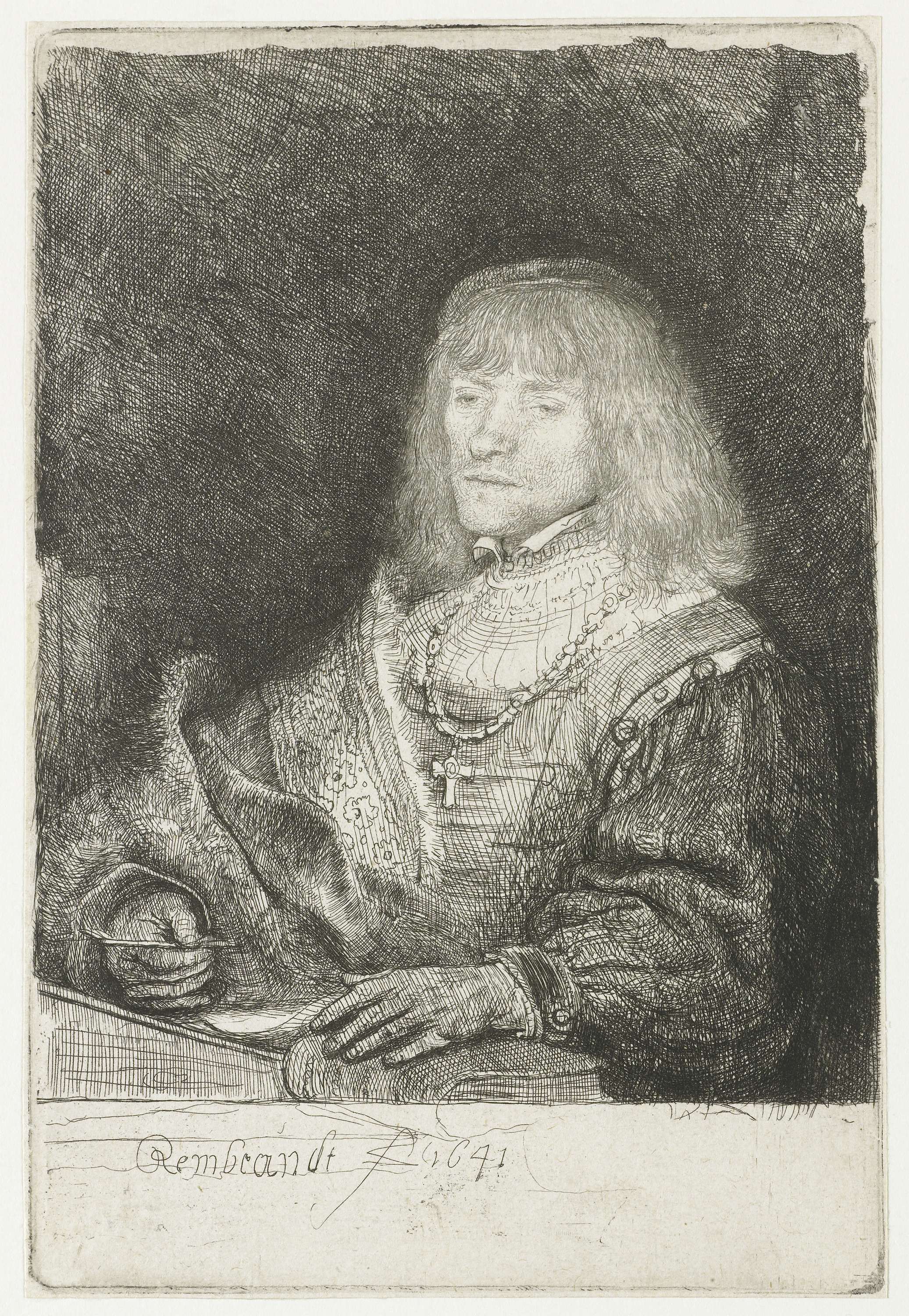 Staande achter een lessenaar overpeinst deze man wat hij schrijven zal. Hij draagt een weelderig 16de-eeuws kostuum, met een kostbare mantel over zijn rechterschouder geslagen. Het gezicht is heel verfijnd uitgevoerd, maar wie dit voorstelt is niet duidelijk. Rembrandt verbeeldde zijn klanten wel vaker ‘op zijn antieks’ gekleed.