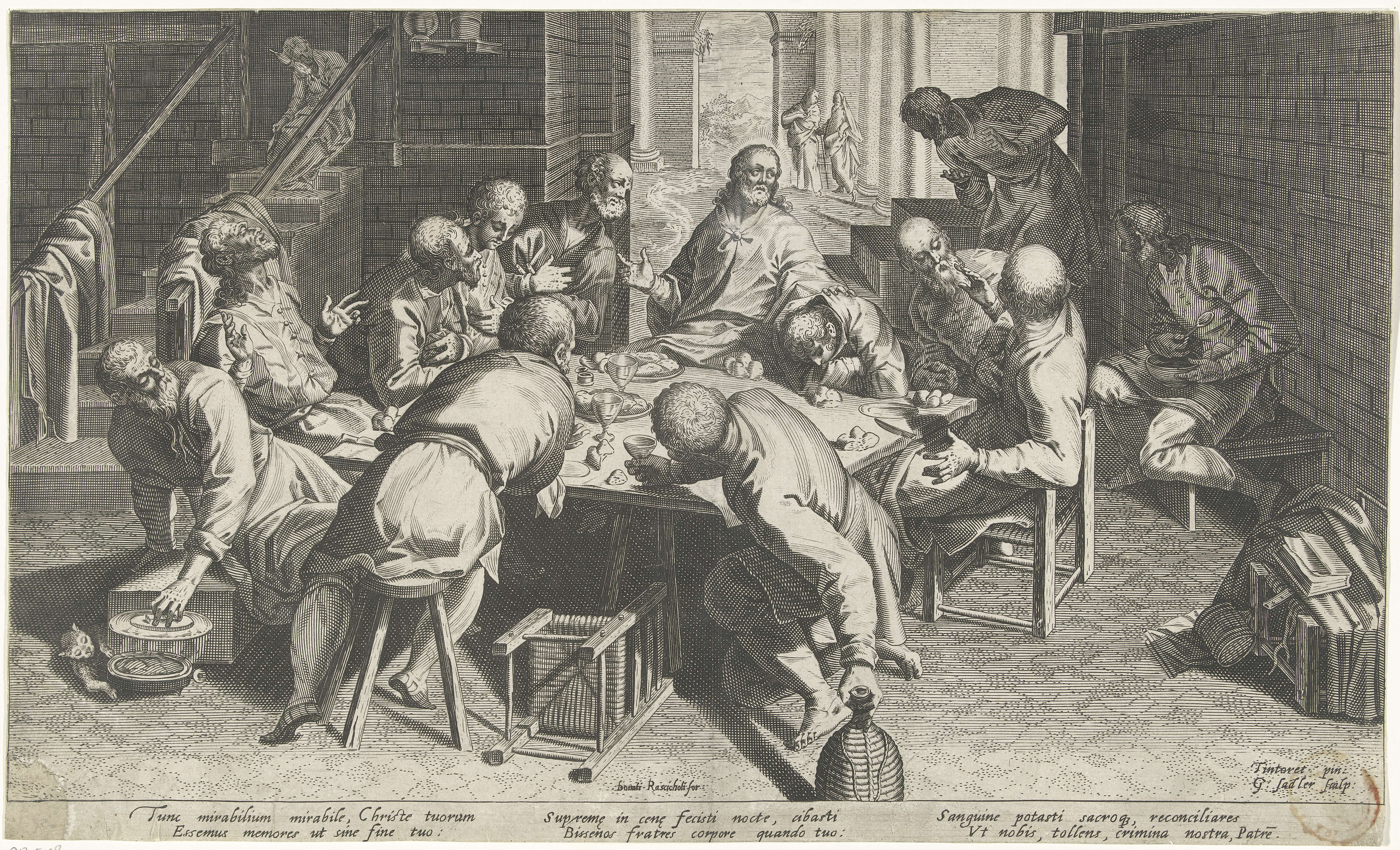 Christus zit samen met zijn leerlingen aan een rechthoekige tafel. Er wordt gegeten en gedronken. De prent heeft een Latijns onderschrift over dit Bijbelverhaal.