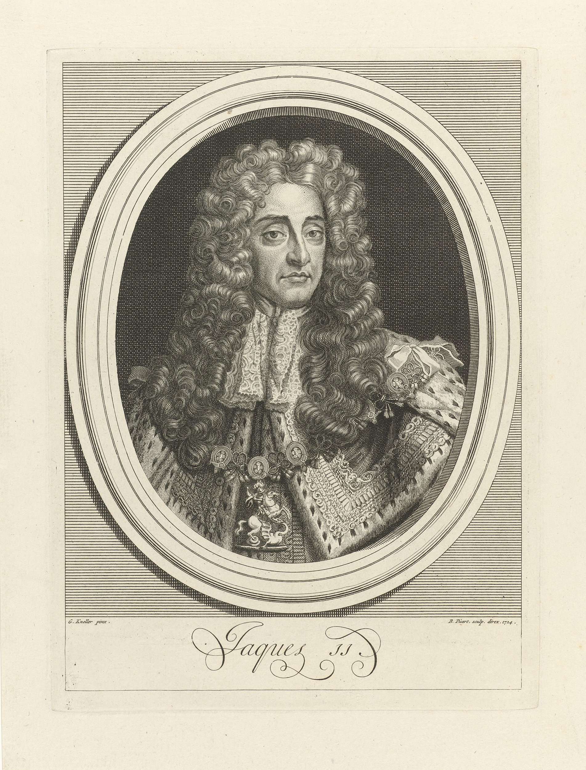 Portret van Jacobus II, koning van Engeland. Hij draagt een keten met de de Constantijnse militaire Orde van Sint Joris.