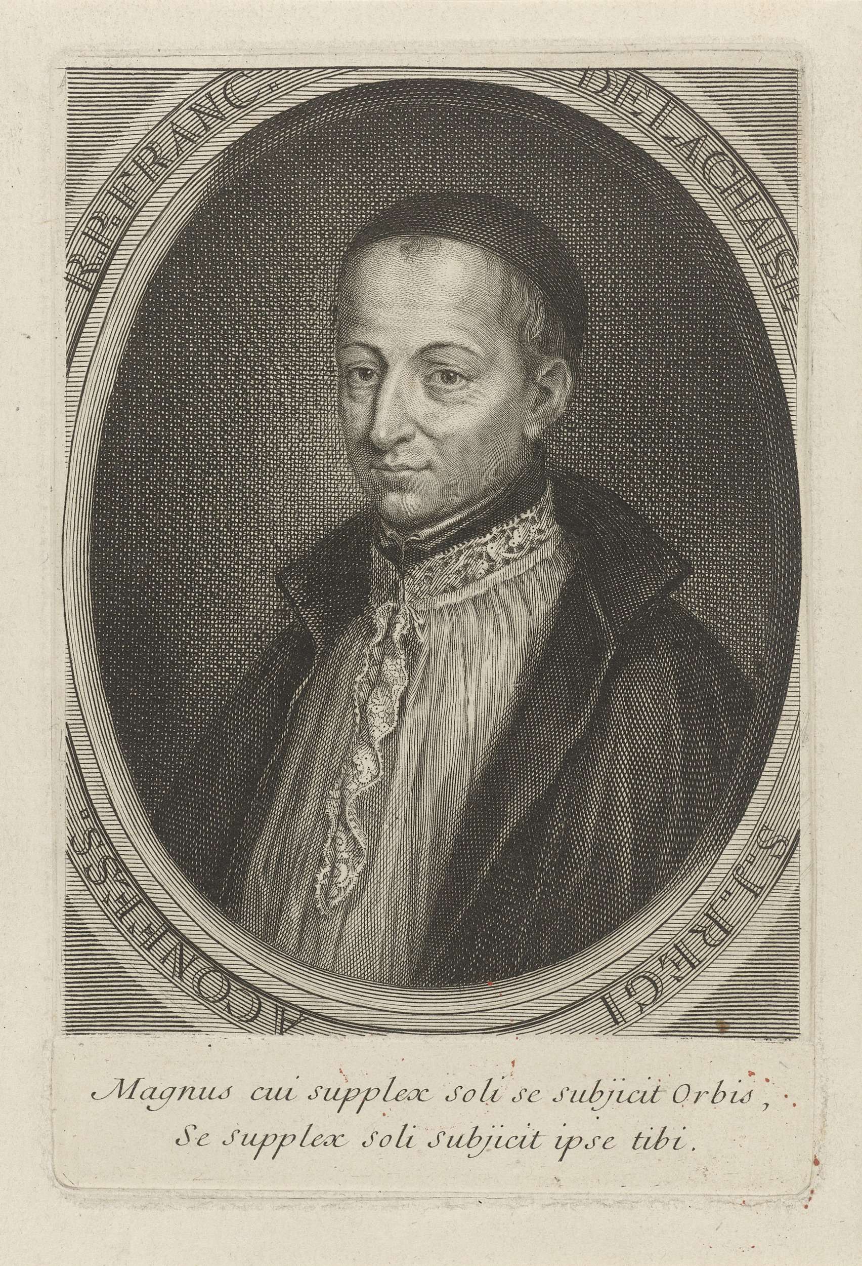Portret van de Franse geestelijke François de la Chaise. Hij draagt een kalot. In de marge een tweeregelig onderschrift in het Frans.