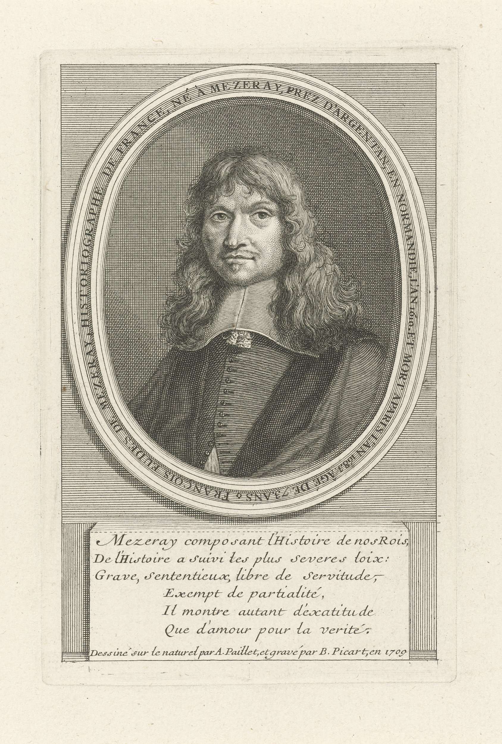 Portret van de Franse historiograaf François Eudes de Mézeray. In het kader een zesregelig lofdicht in het Frans.