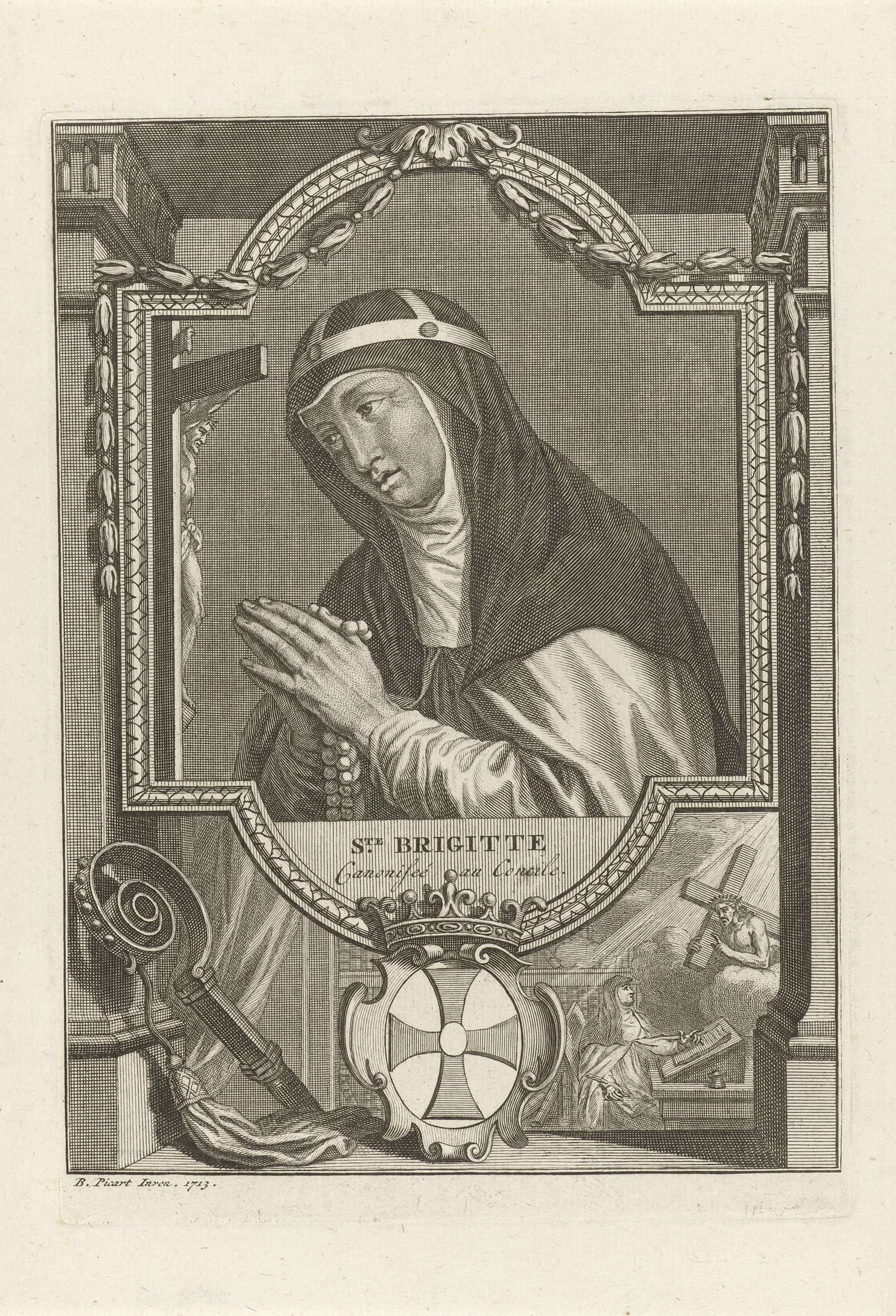 De Heilige Brigitta bidt de rozenkrans voor een crucifix. Rechtsonder ziet zij een visioen van Christus met zijn kruis.