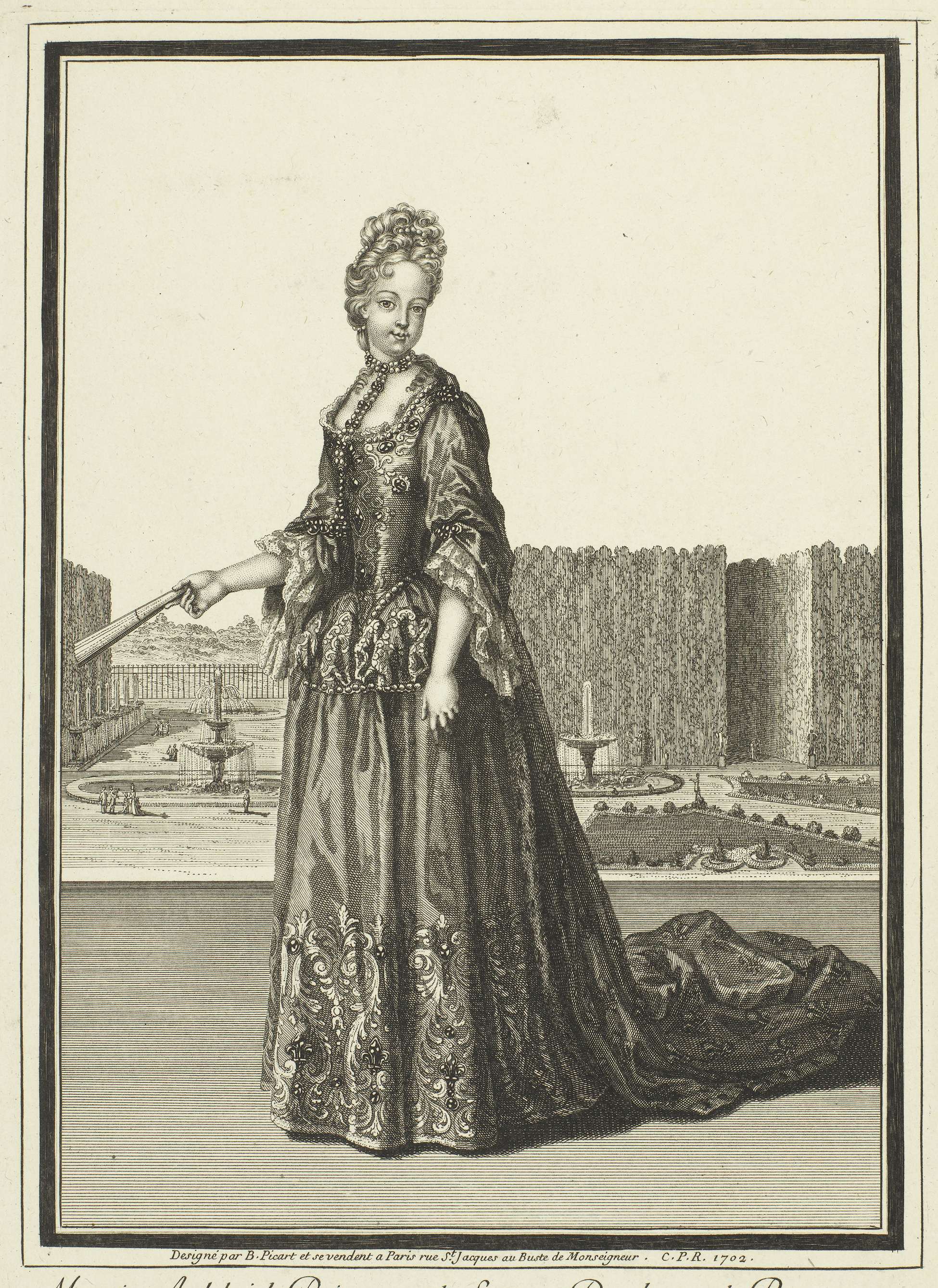 Portret van Maria Adelheid van Savoye, hertogin van Bourgondië. Op de achtergrond een paleistuin met fonteinen en hooggeschoren hagen. Zij is gekleed in modieuze kleding van het begin van de achttiende eeuw, een dichtgevouwen waaier in de rechterhand.