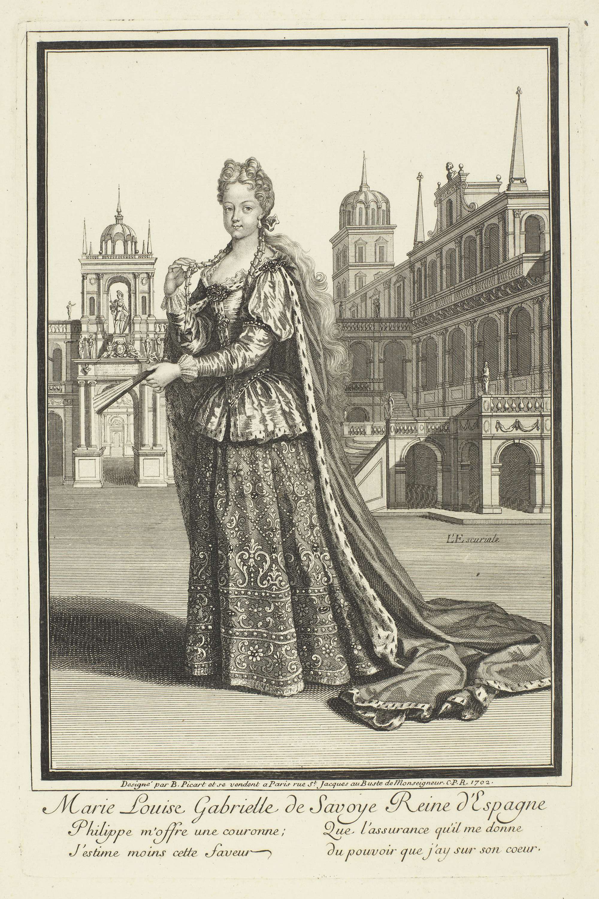 Portret van Marie Louise van Savoye, koningin van Spanje. Zij houdt een gesloten waaier in de linkerhand, met de rechterhand houdt zij een van haar twee vlechten vast. Over haar japon draagt ze een mantel, afgezet met hermelijn. Op de achtergrond het Escorial. In de marge een vierregelig liefdesgedicht, in twee kolommen, in het Frans.