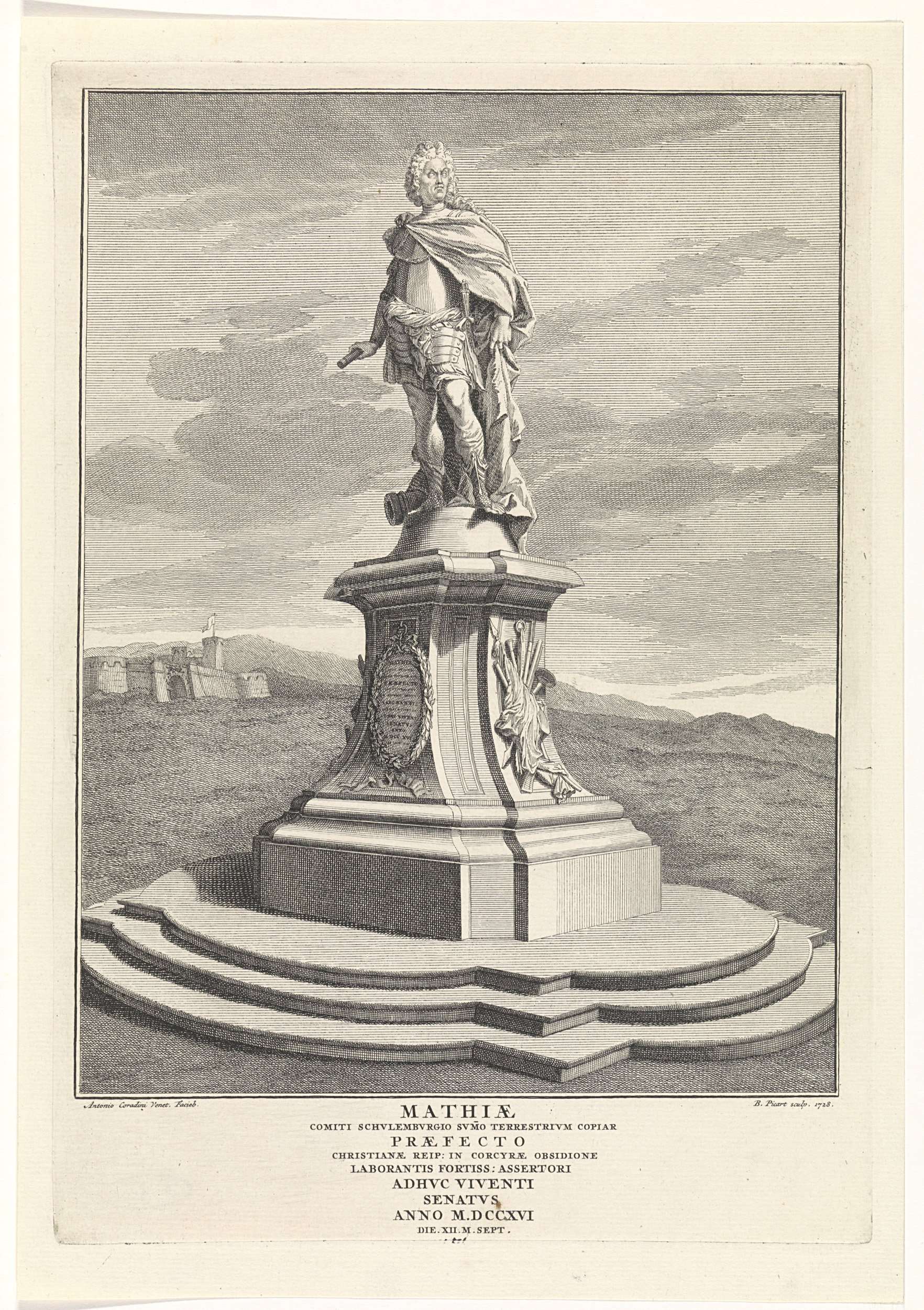 Landschap met het standbeeld van Johann Matthias, graaf van Schulenburg. Het beeld werd gemaakt door Antonio Corradini in 1716 en bevindt zich op Corfu. In de marge een onderschrift in het Latijn.