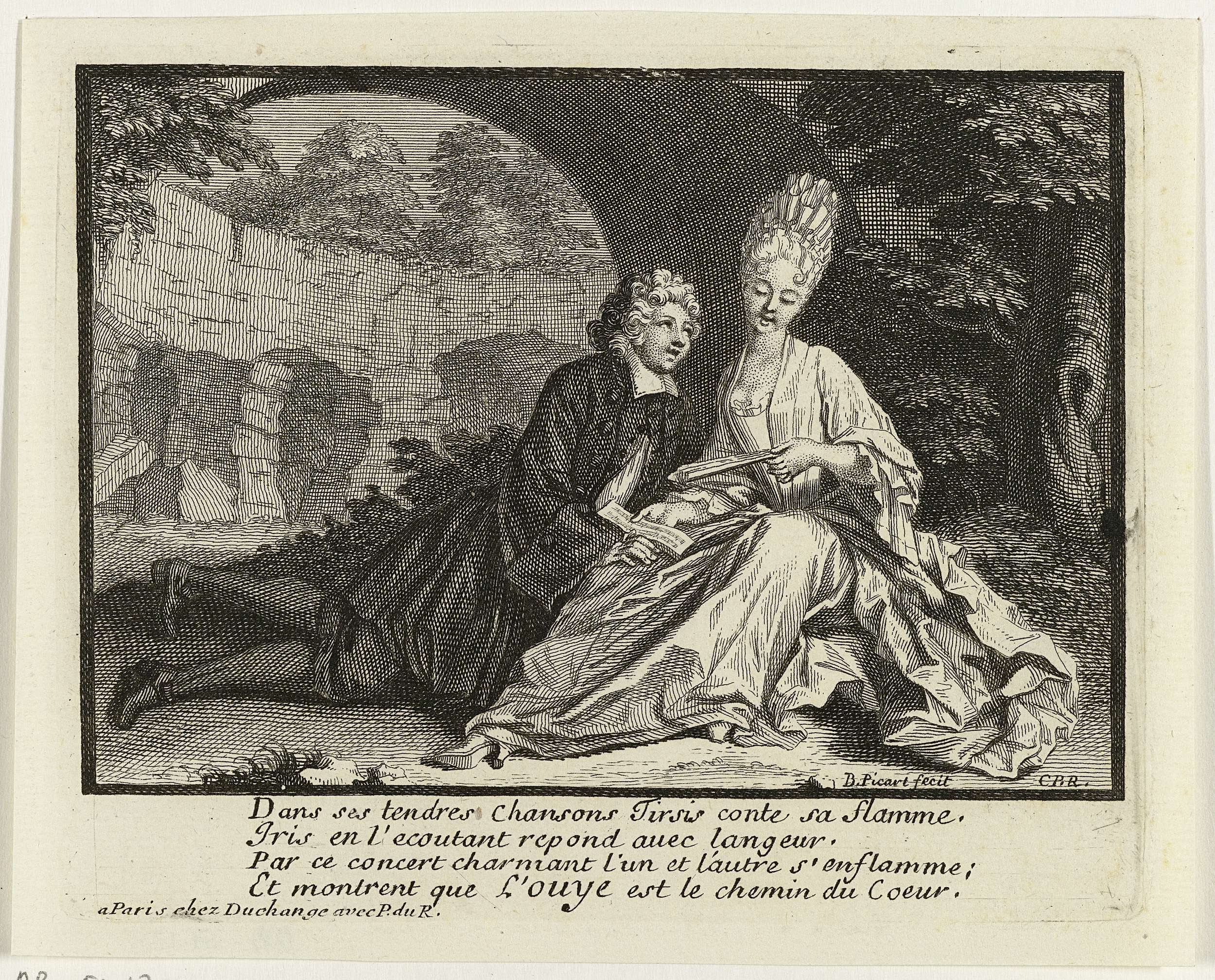 Landschap met een elegant gekleed paar dat bij een ruïne zit en zingt. De vrouw houdt een opengeslagen liedboek en een waaier in de handen. In de marge een vierregelig gedicht in het Frans.