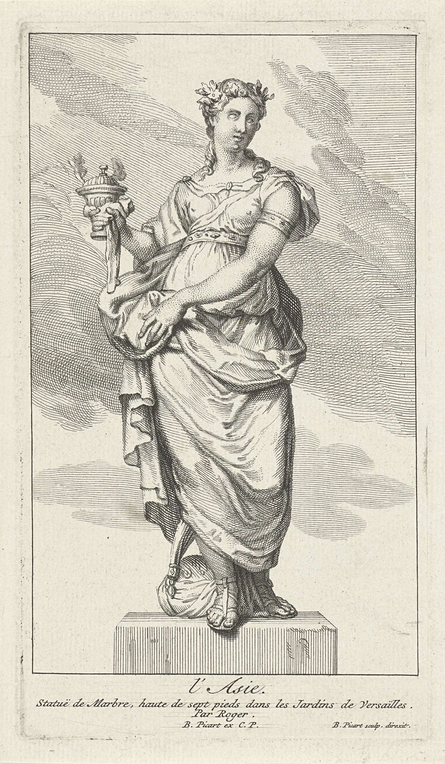 Standbeeld in de tuinen van Versailles. De vrouwelijke personificatie van Azië, gekroond met een bloemenkrans, een wierookvat in de hand. Aan haar voeten een tulband. In de marge een onderschrift in het Frans.