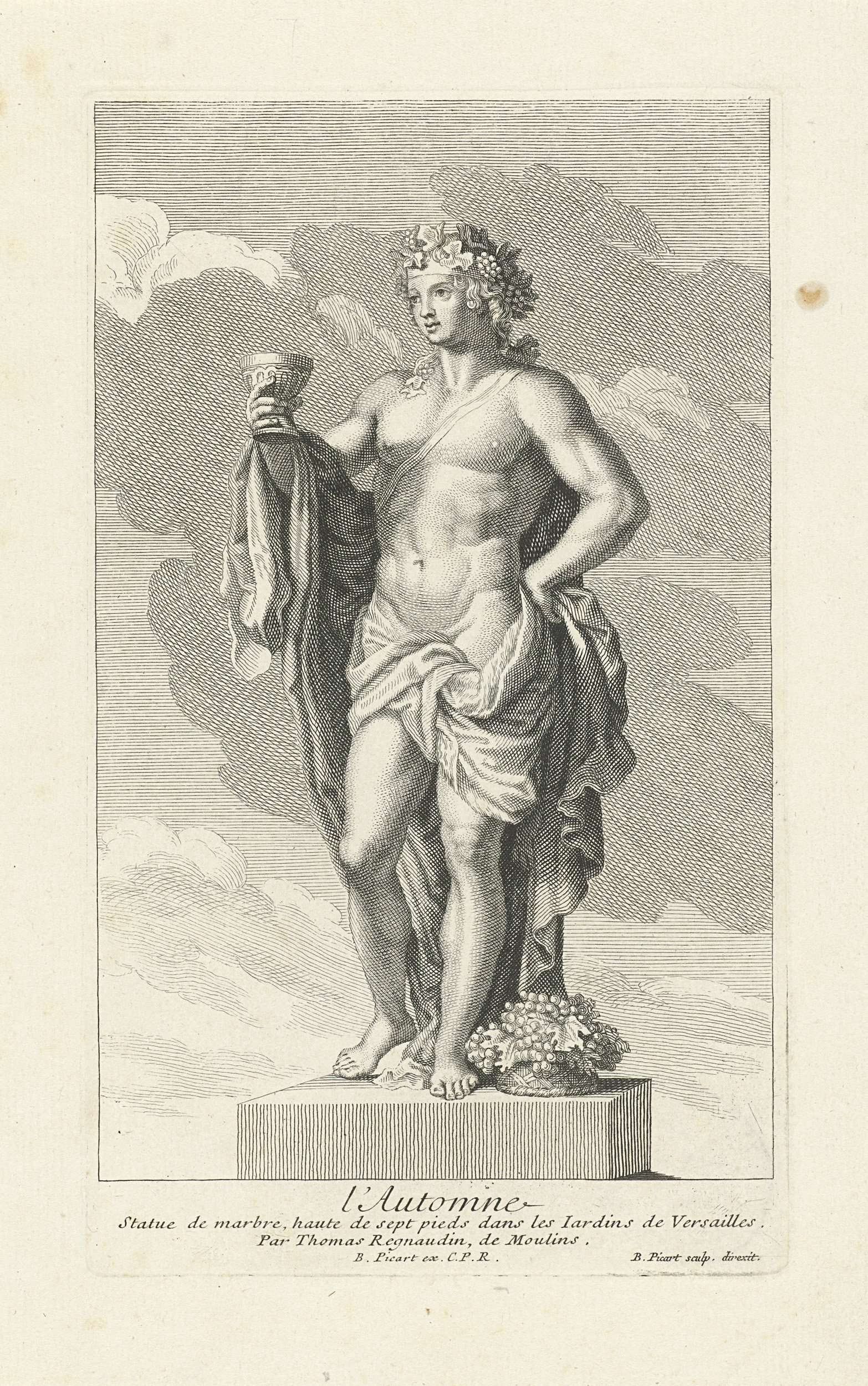 Standbeeld in de tuinen van Versailles. De mannelijke personificatie van Herfst, een drinkbeker in de hand. Aan zijn voeten een tros druiven. In de marge een onderschrift in het Frans.