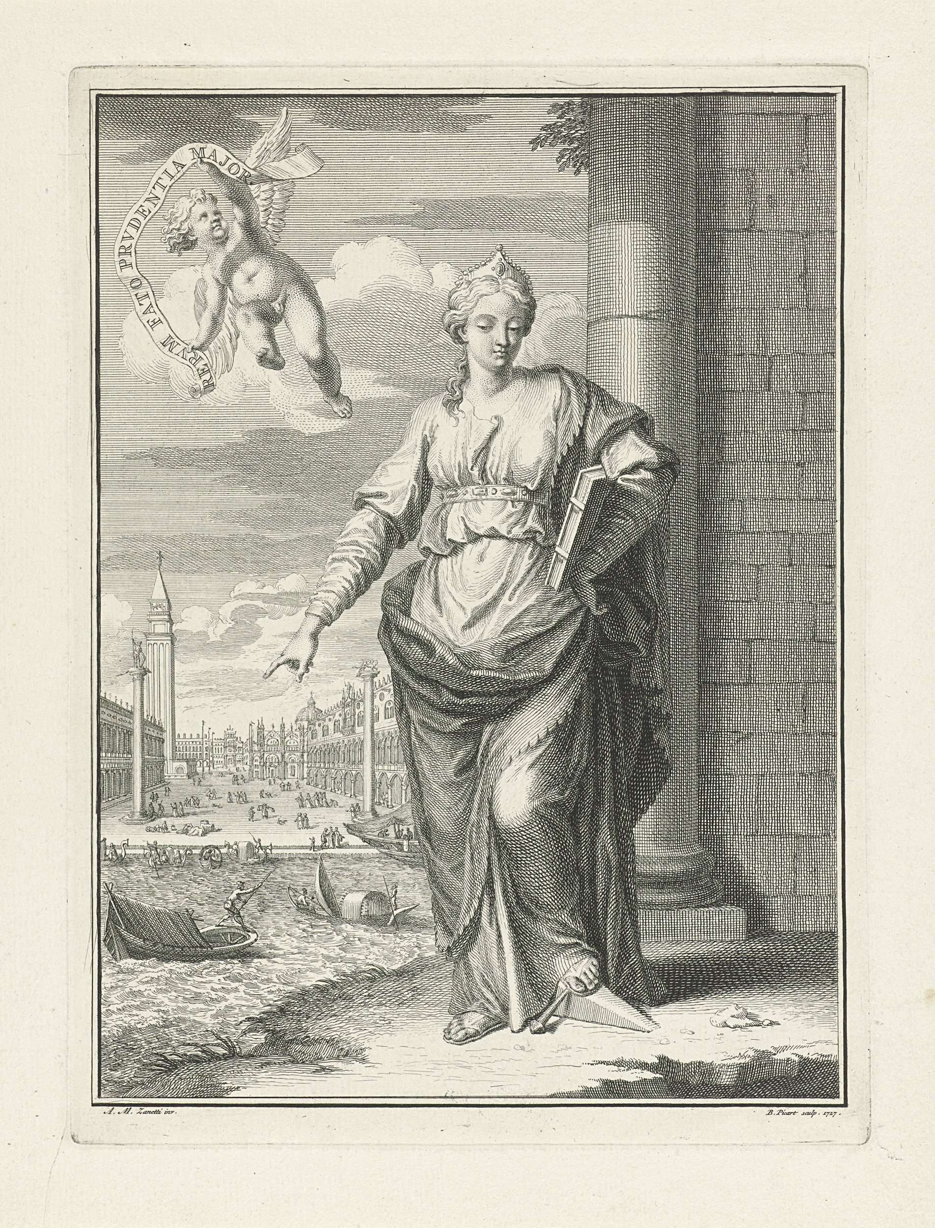 Een gekroonde vrouw (Voorzichtigheid?), met een boek onder de arm, wijst op de aarde. Aan haar voeten een wig en een nagel. In de lucht een putto met een banderol waarop een opschrift in het Latijn. Op de achtergrond een gezicht op het San Marcoplein te Venetië.