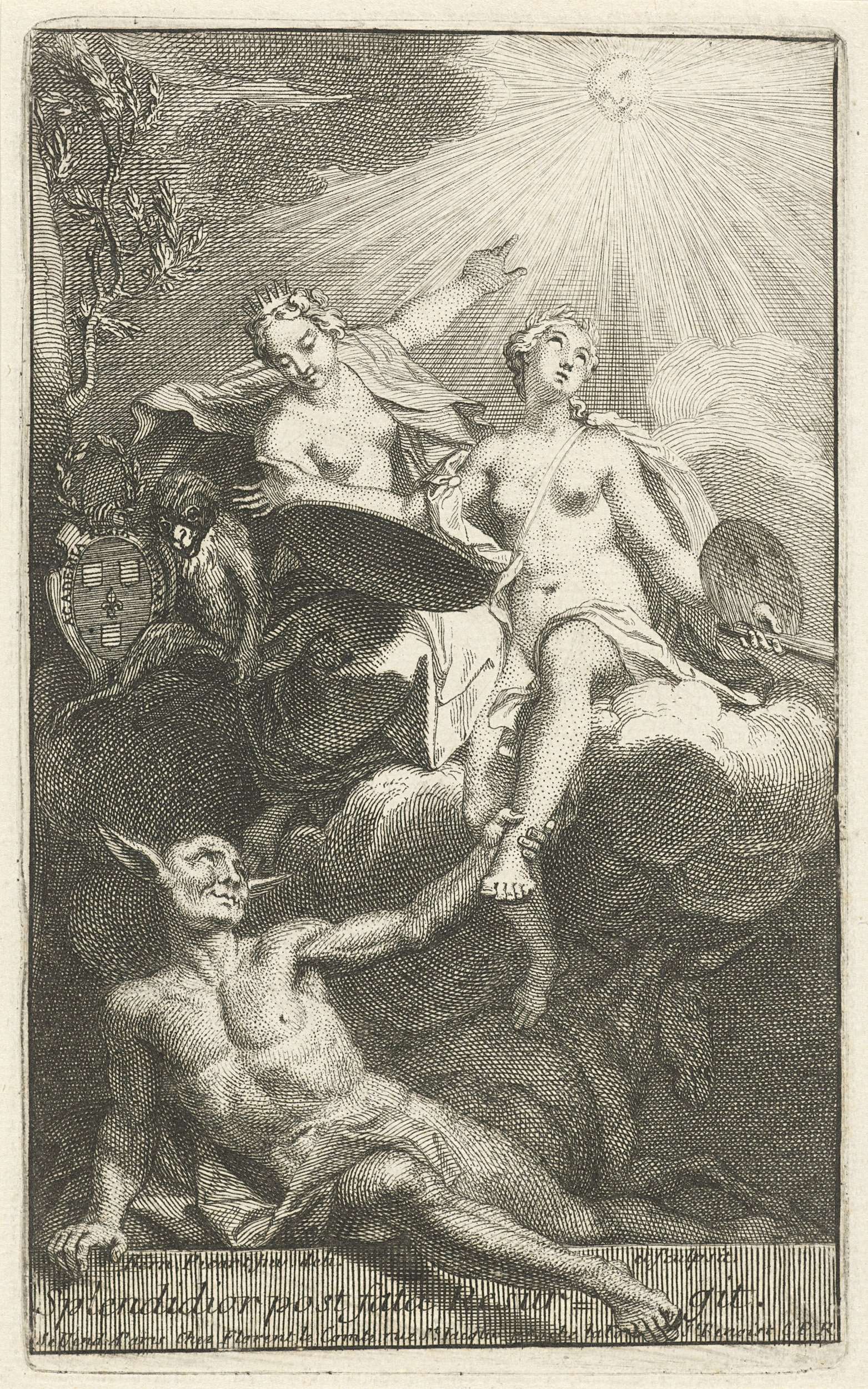De gelauwerde Schilderkunst kijkt op naar de hemel. Ze wordt vergezeld door een gekroonde vrouw die naar de zon wijst. Links een aap met een wapenschild. Op de voorgrond een man met ezelsoren, die Schilderkunst aan de voet van de wolk probeert af te trekken.