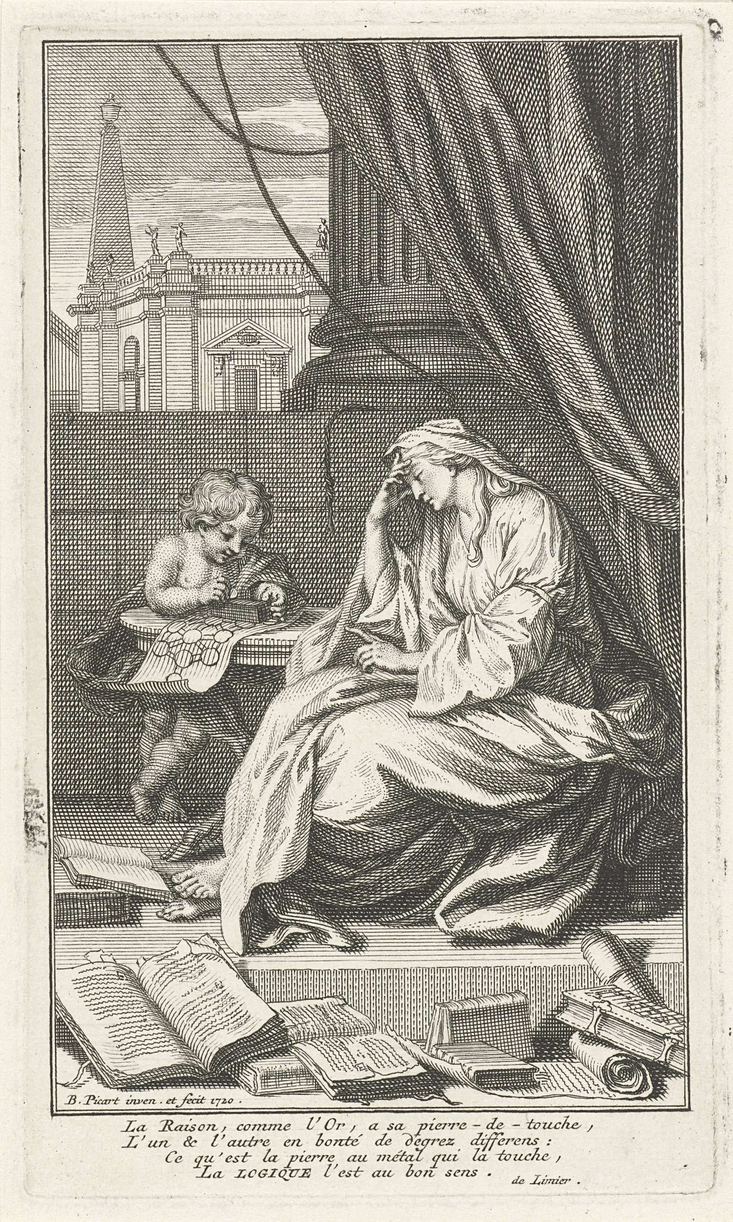 De vrouwelijke personificatie van Logica, een van de zeven vrije kunsten. Zij denkt na en onderwijst een putto. Op de voorgrond allerlei boeken. In de marge een vierregelig gedicht in het Frans.