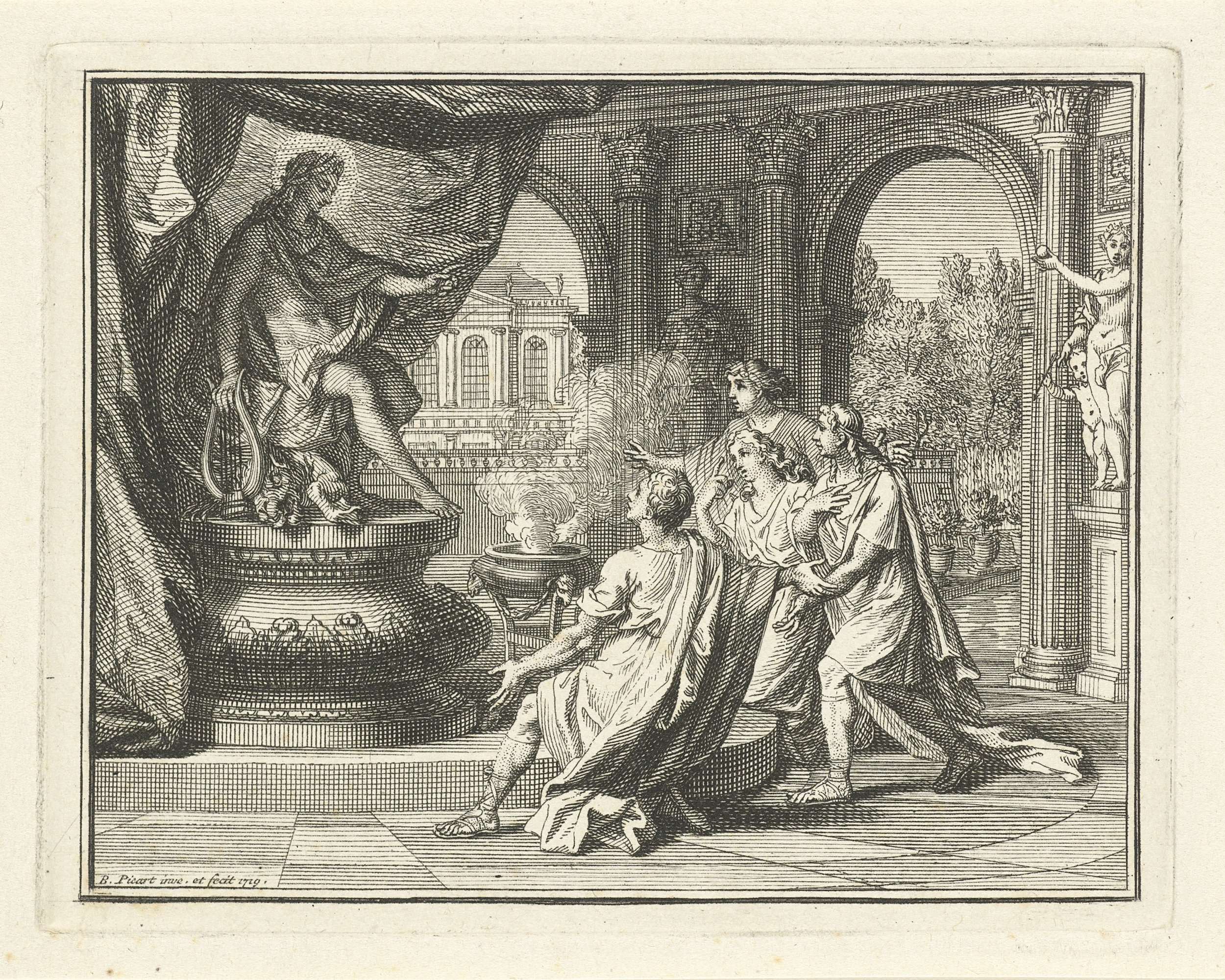 Twee mannen en twee vrouwen brengen een offer aan Apollo. In de tempel knielen ze voor diens standbeeld. Voor hen een brandende offerzuil.