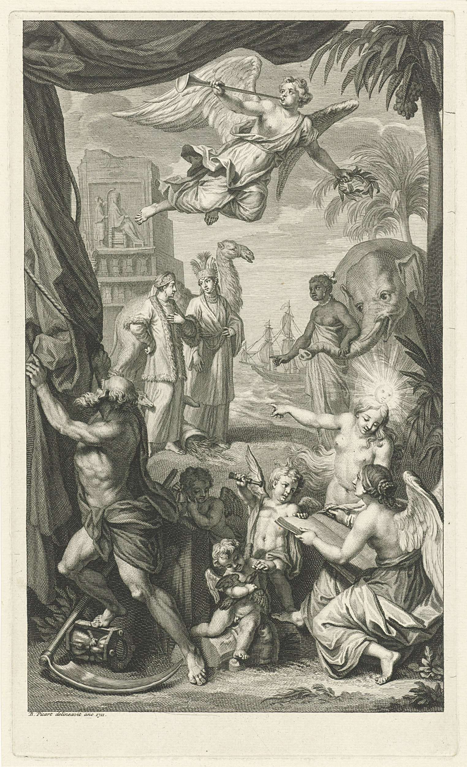 Vader Tijd schuift een draperie opzij en onthult het tafereel. Geschiedenis schrijft in een boek. Ze wordt vergezeld door putti met verschillende attributen in de handen. De gepersonifieerde Waarheid, een stralende zon boven het hoofd, wijst haar op de achtergrond. Daar wandelen twee personen, mogelijk Perzen, met een dromedaris en een zwarte vrouw met een ...