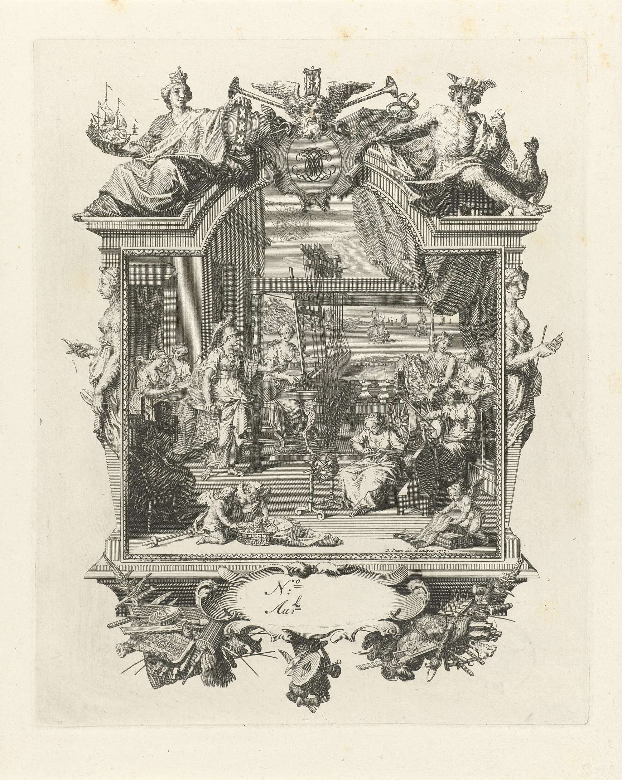 Minerva bezoekt vrouwen die wol spinnen en stof weven. Ze houdt een weefpatroon in de hand en wijst op vrouwen die de stof bekijken. Boven het weefgetouw een spinnenweb, als verwijzing naar Arachne die door haar in een spin is veranderd. Op de achtergrond een gezicht op zee. De voorstelling is gevat in een uitbundig ...
