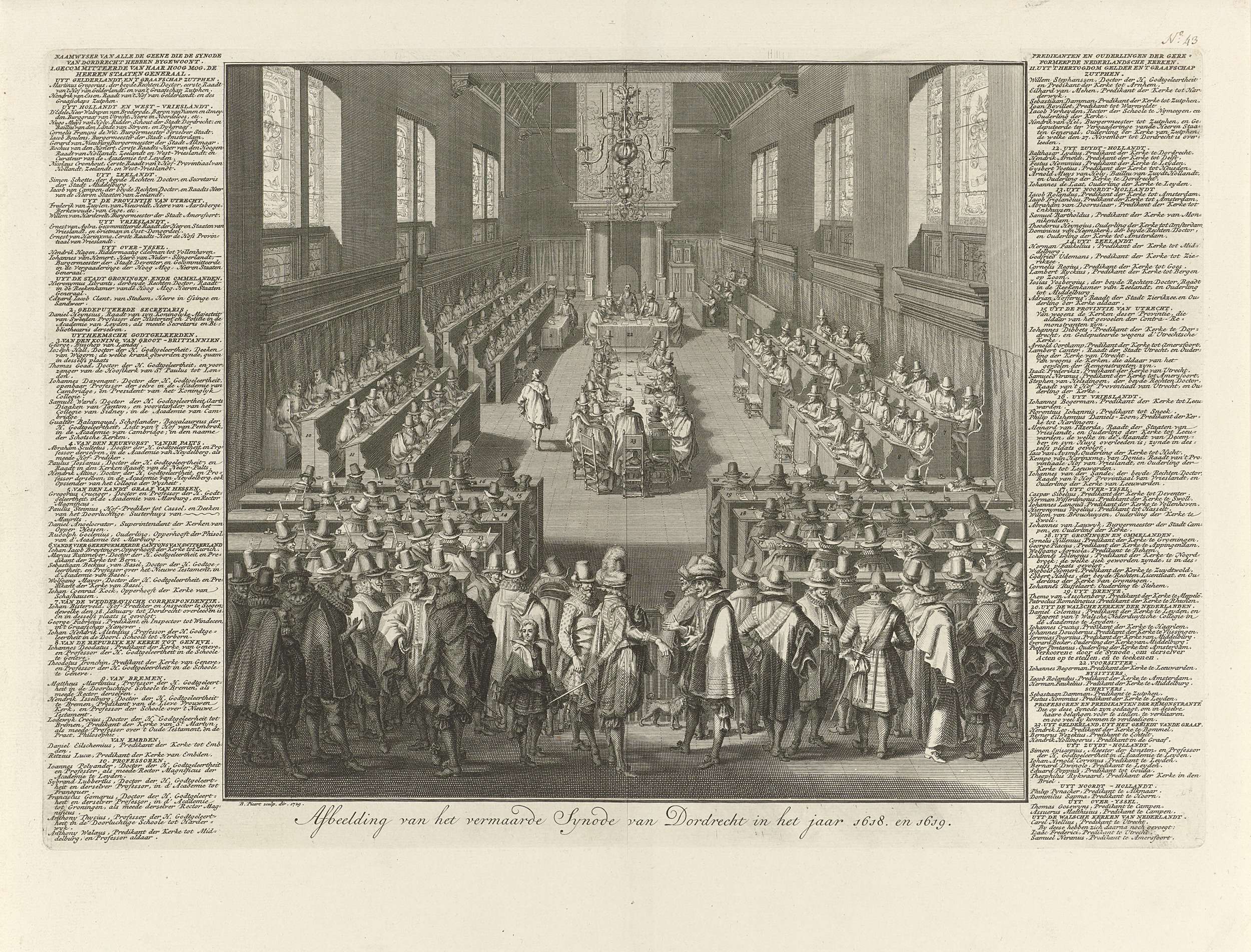 De opening van de nationale synode te Dordrecht op 13 november 1618. De grote zaal van de Kloveniersdoelen met alle aanwezigen en toeschouwers. De deelnemers aan de synode zijn met cijfers aangeduid die verwijzen naar de corresponderende legenda in de kolommen aan weerszijden van de voorstelling.